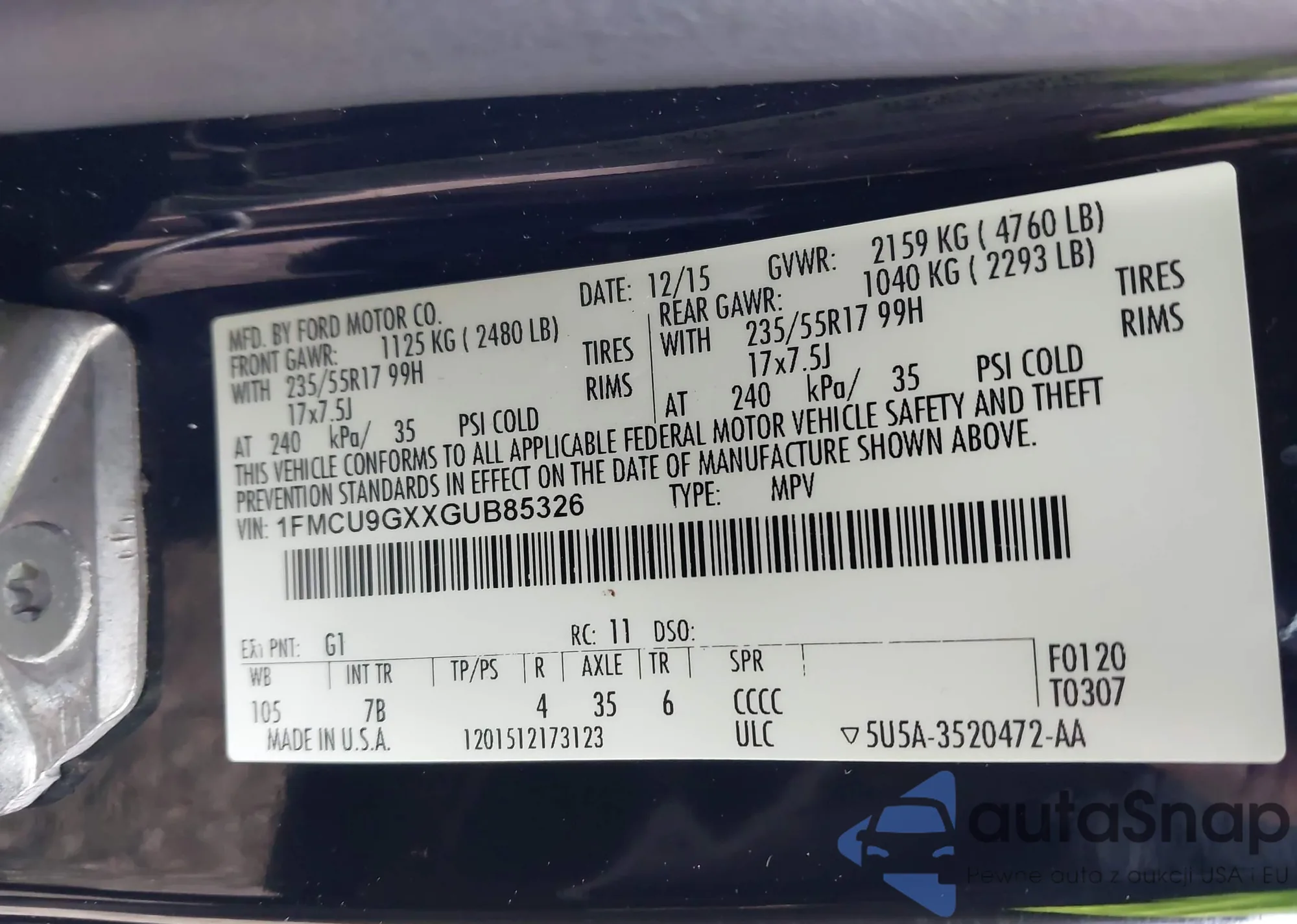 LOT: 42046732 VIN: 5XXGT4L31JG256876