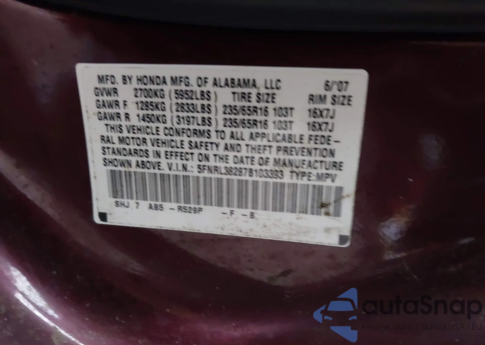 LOT: 42301451 VIN: 5FNRL38287B103393