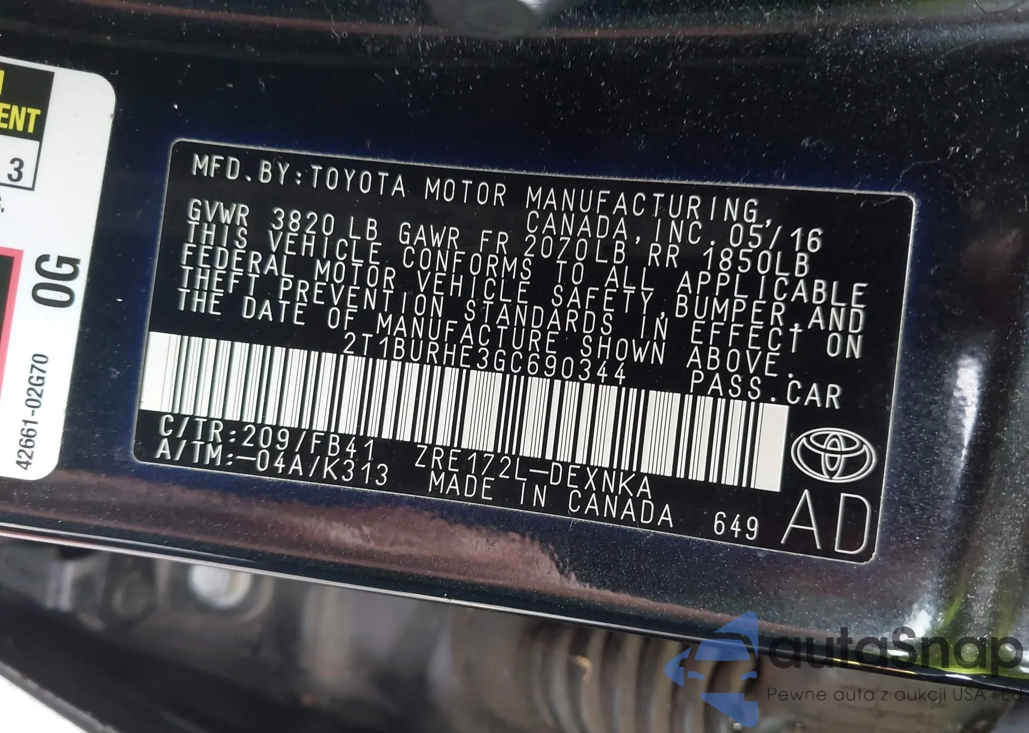 LOT: 42353626 VIN: 2T1BURHE3GC690344