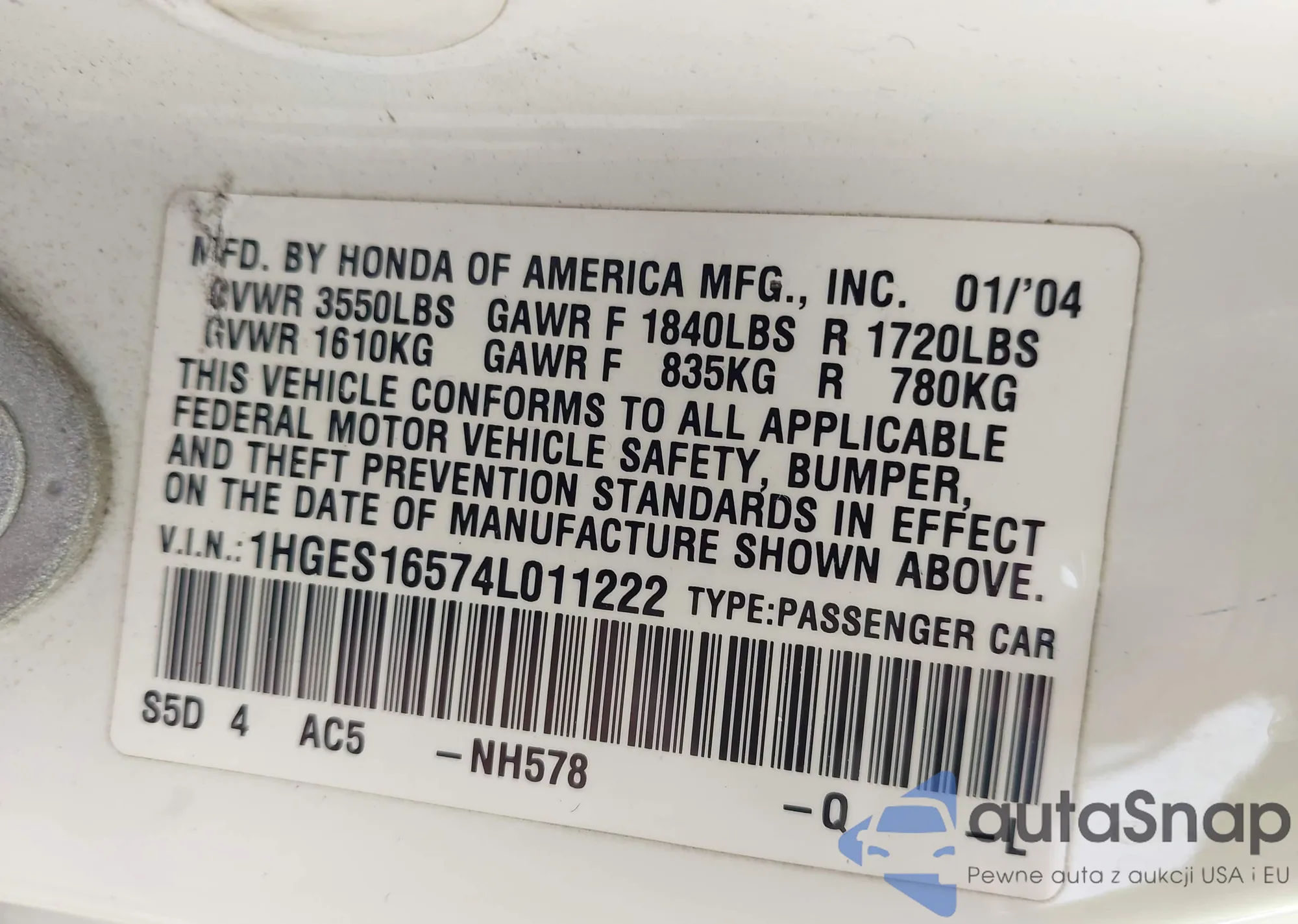 LOT: 42362404 VIN: 1HGES16574L011222