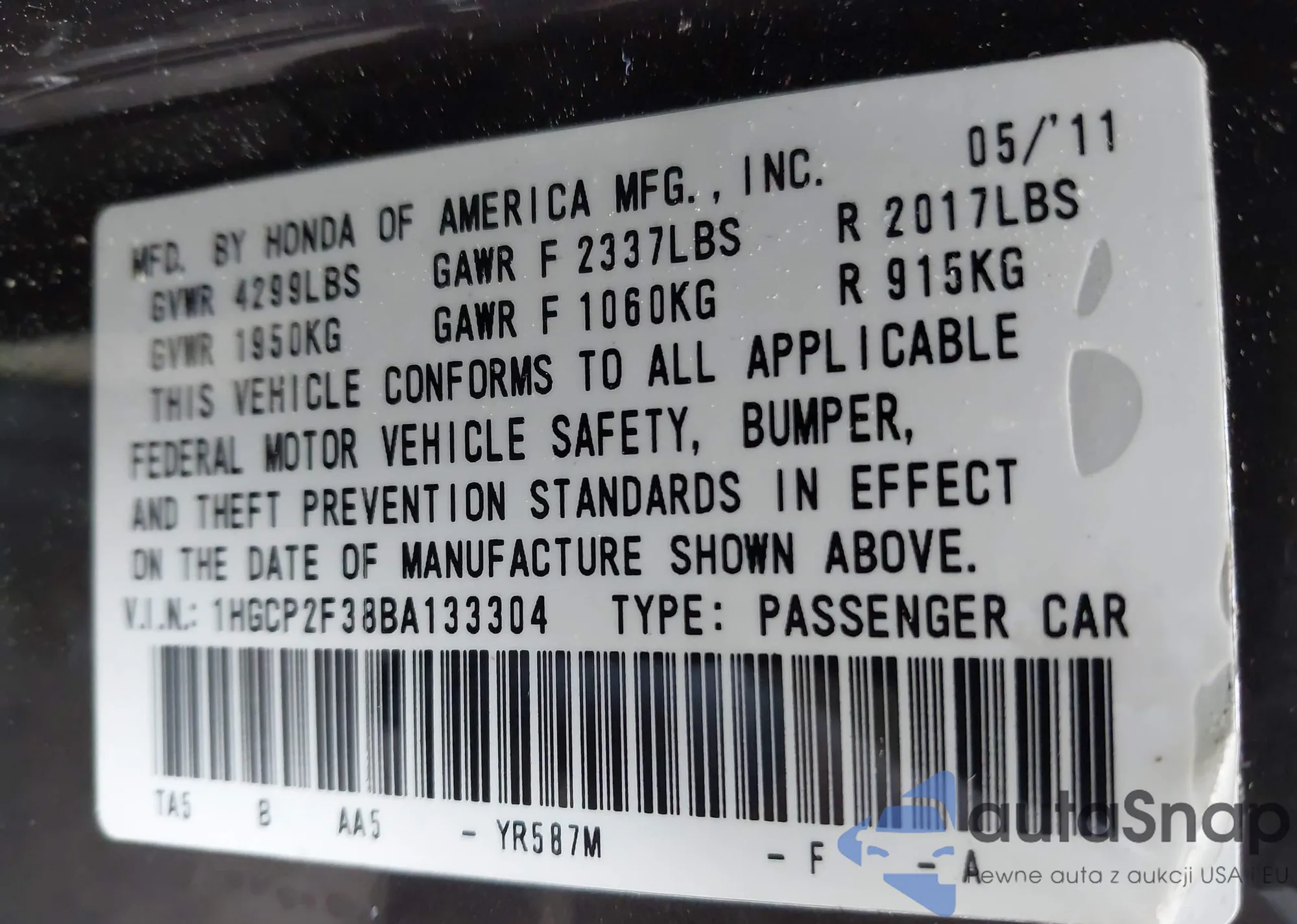 LOT: 42302940 VIN: 1HGCR2F8XHA254995