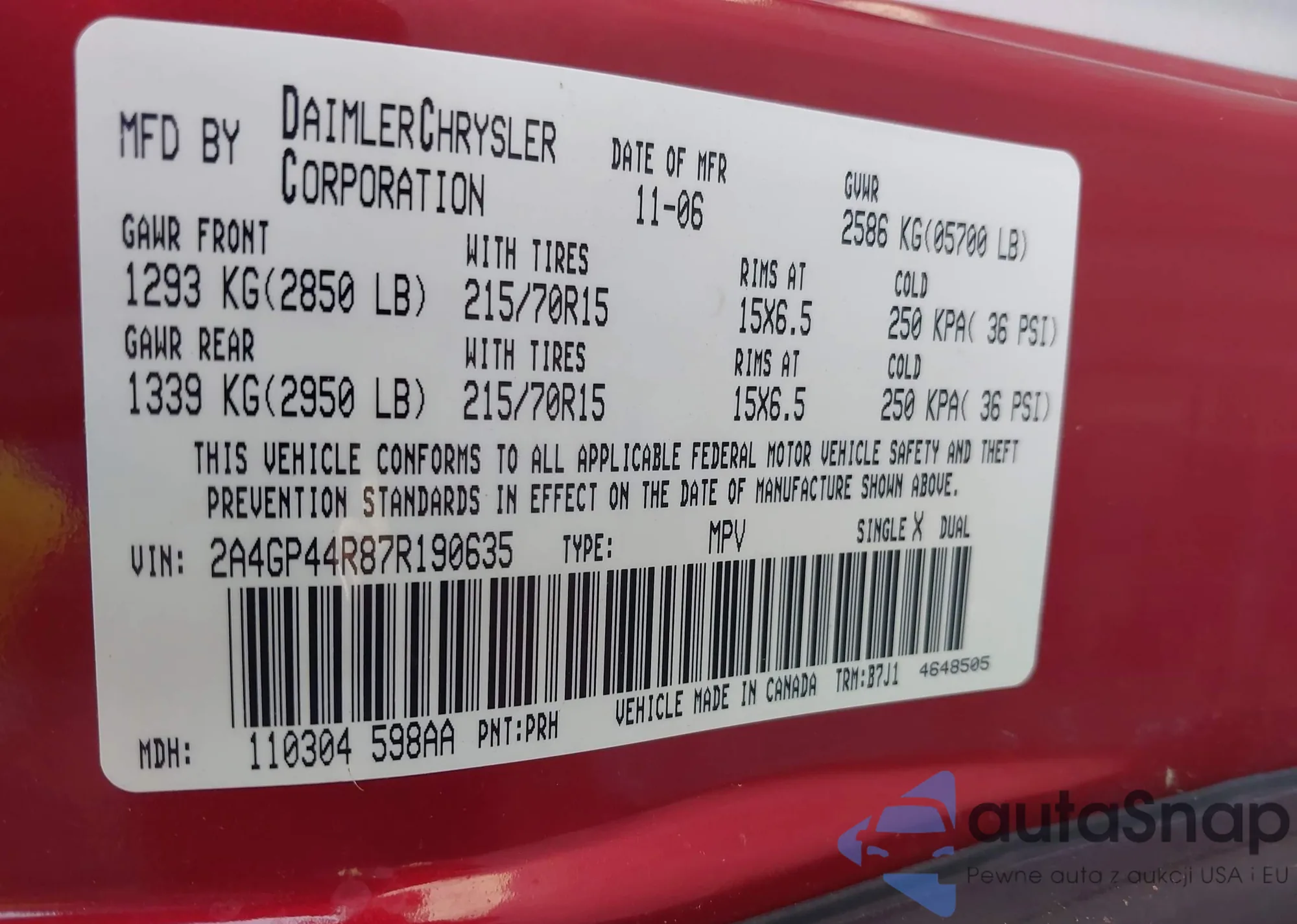LOT: 42279176 VIN: 2A4GP44R87R190635