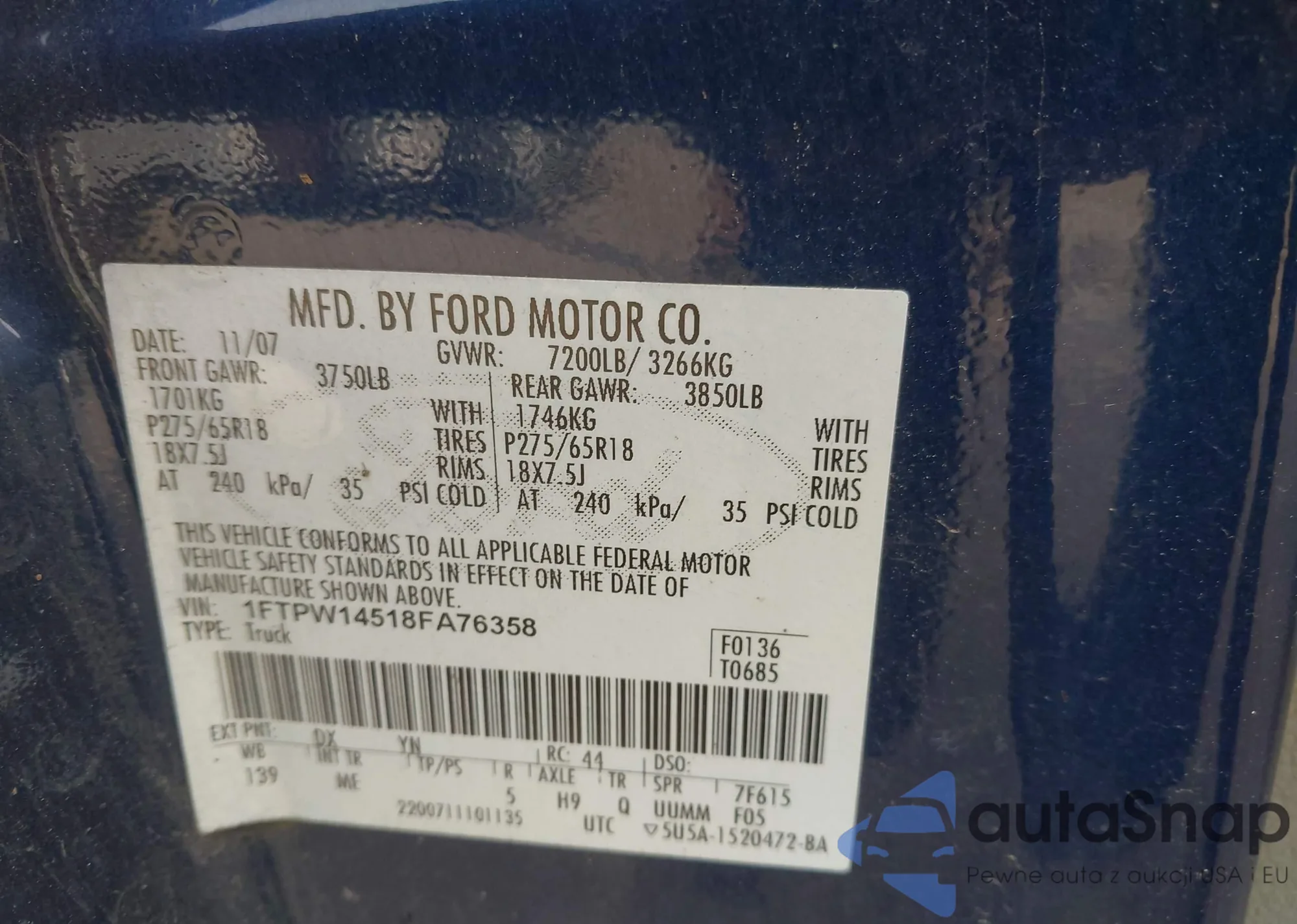 LOT: 42281687 VIN: 1FTPW14518FA76358