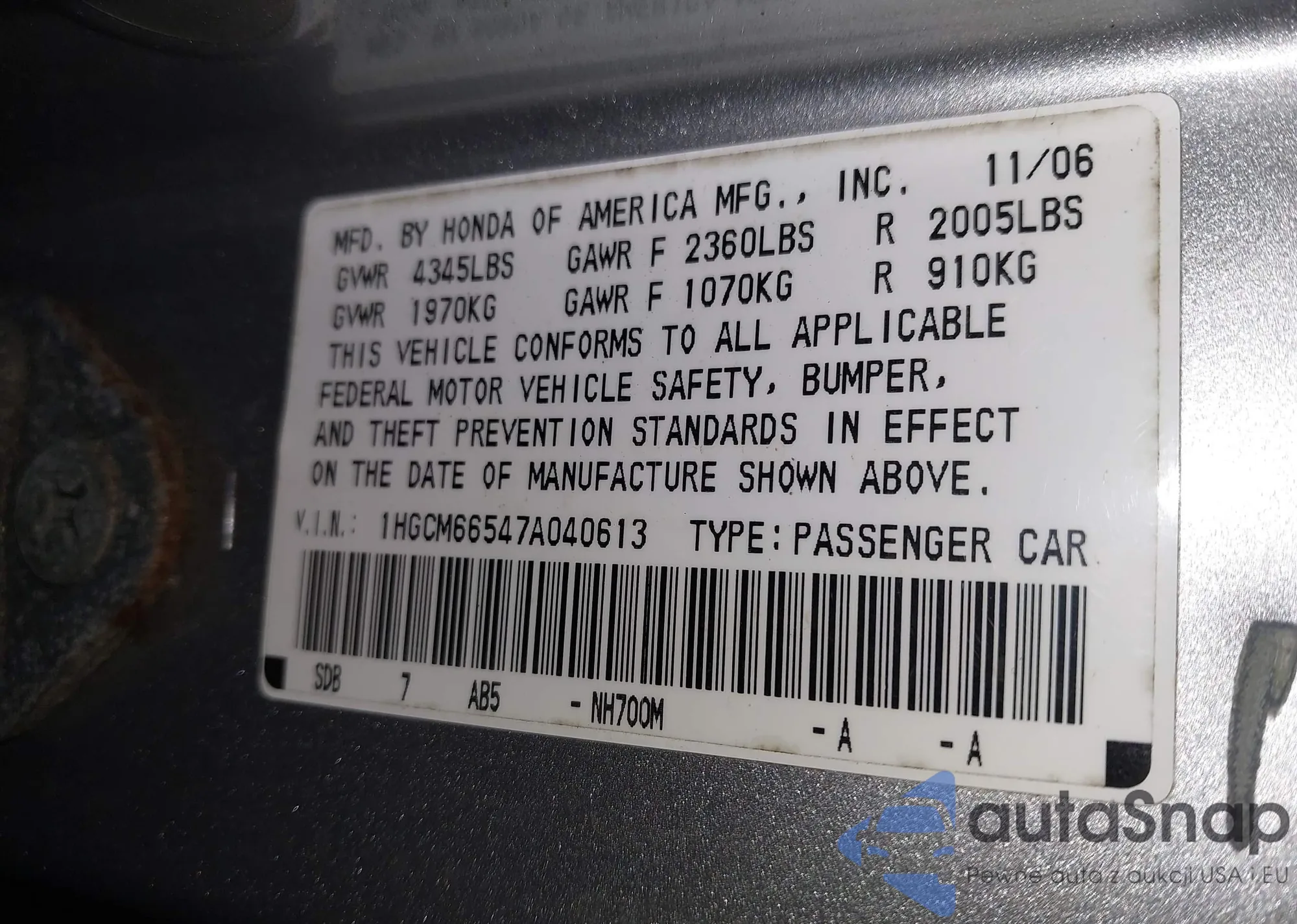 • VIN 1HGCM66547A040613
