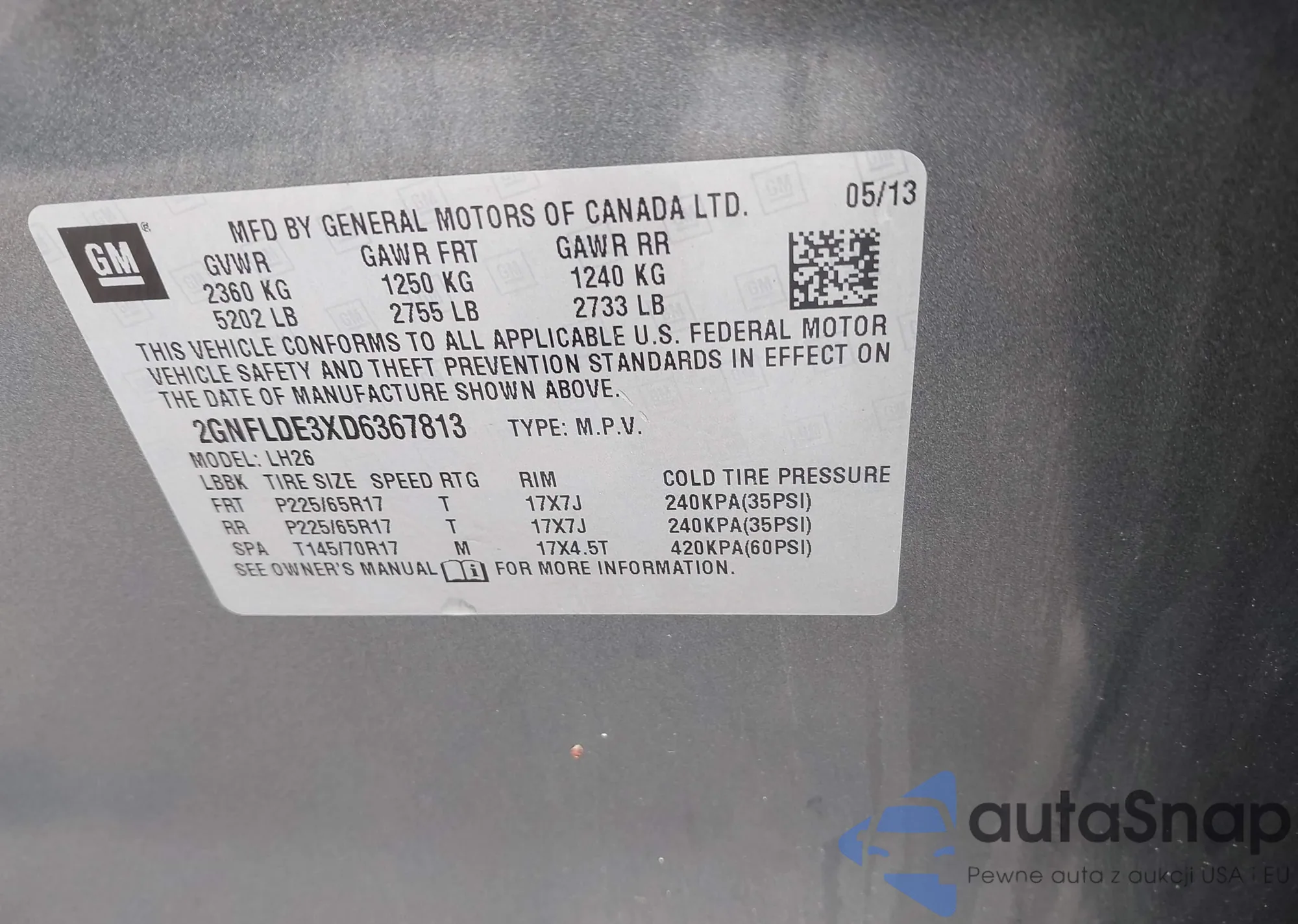 • VIN 2GNFLDE3XD6367813
