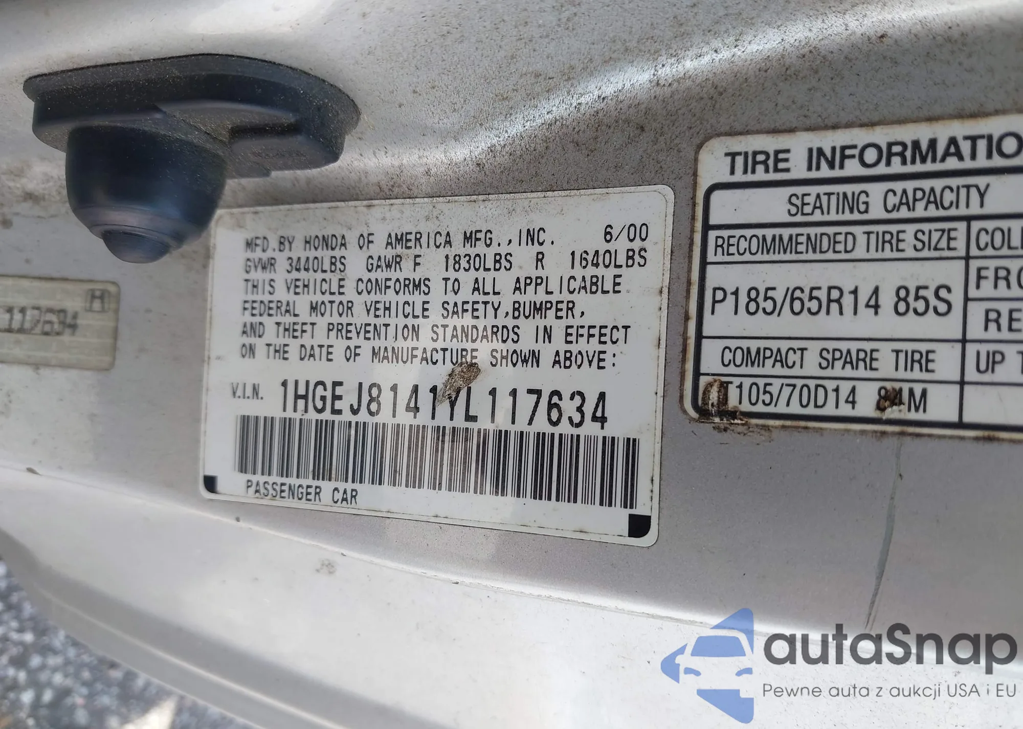 LOT: 42434956 VIN: 1HGEJ8141YL117634