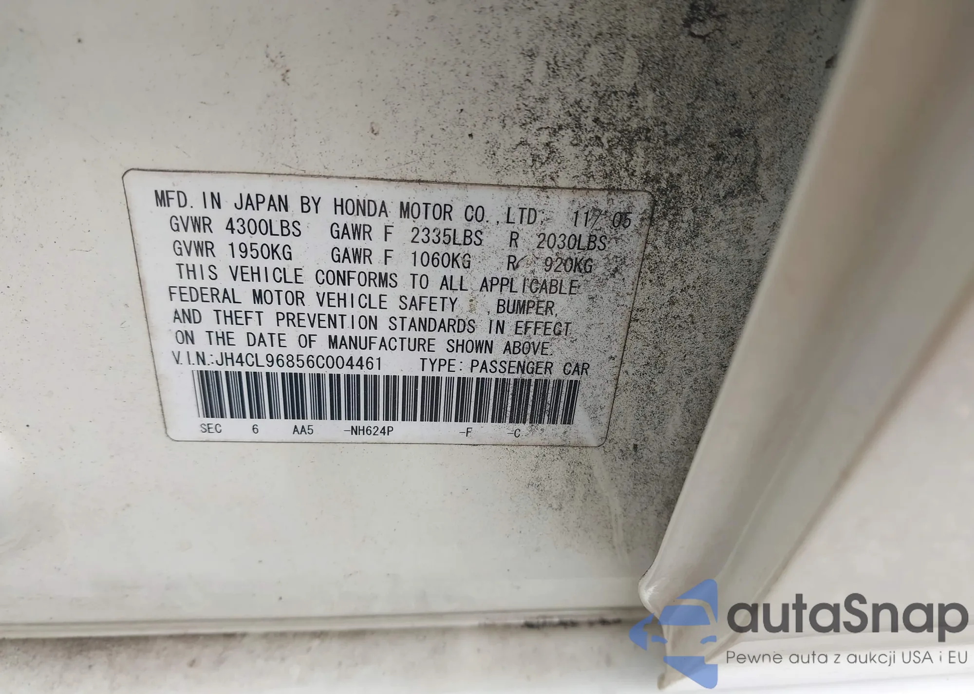 LOT: 42284578 VIN: JH4CL96856C004461