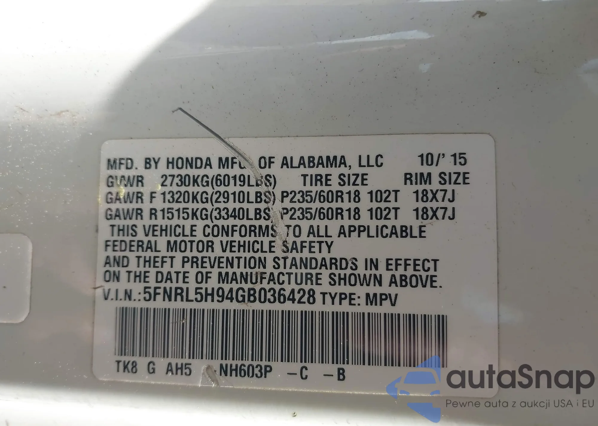 • VIN 5FNRL5H94GB036428