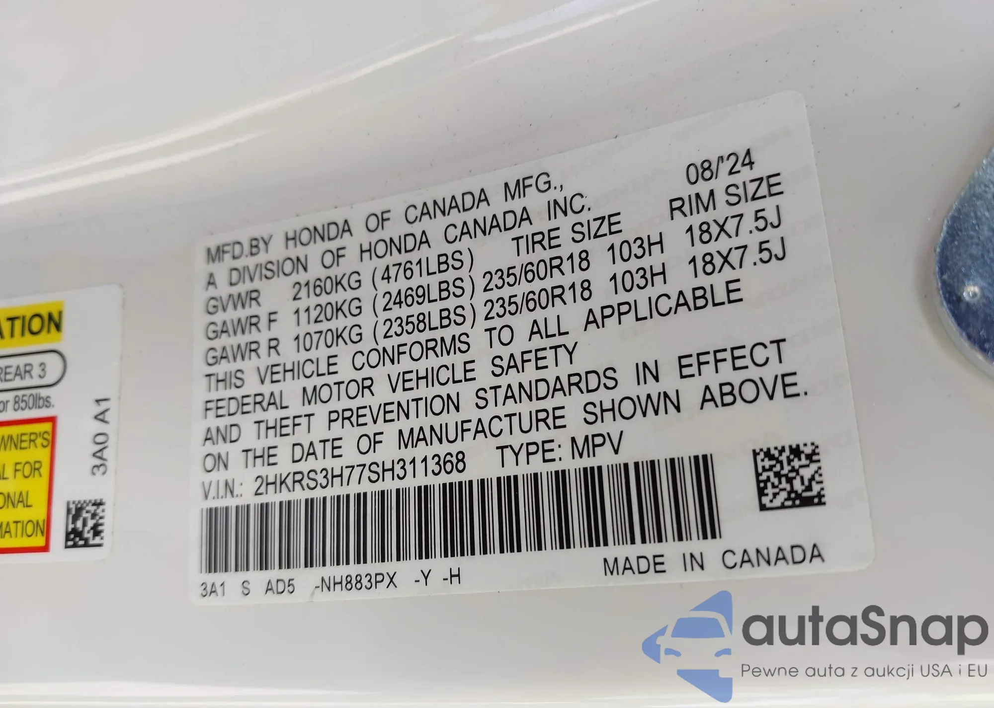 • VIN 2HKRS3H77SH311368