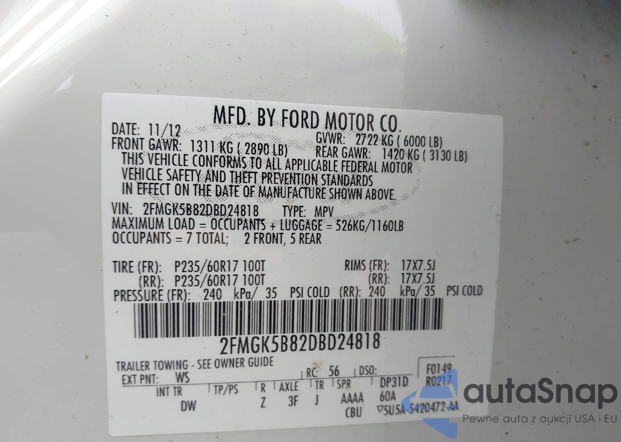 LOT: 42436316 VIN: 5FRYD4H47FB007364