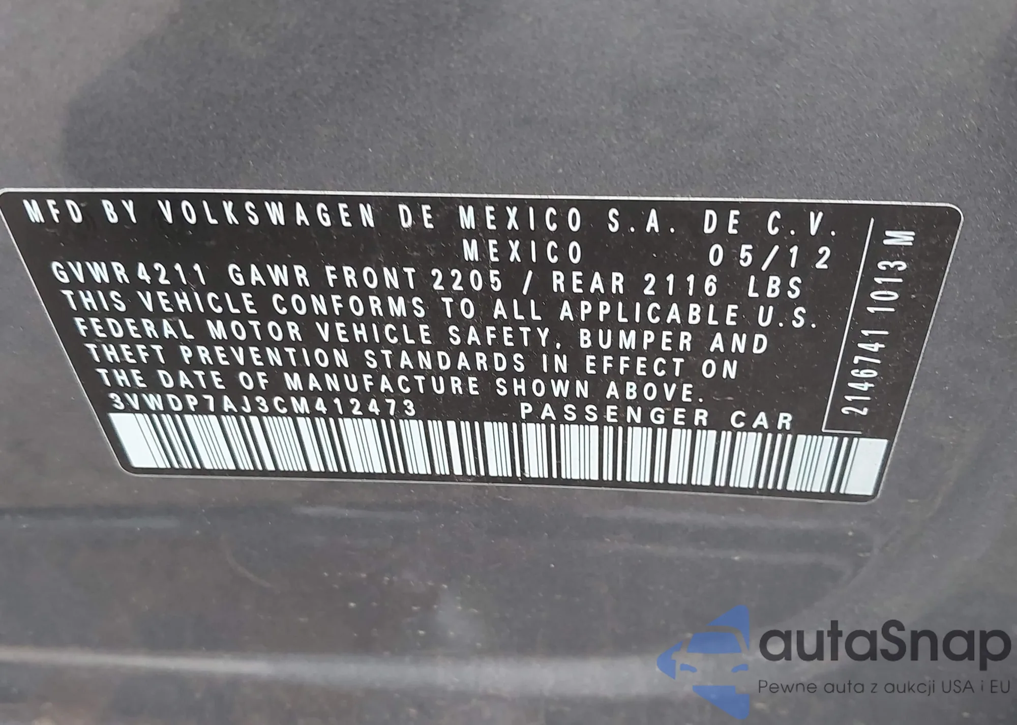 • VIN 3VWDP7AJ3CM412473