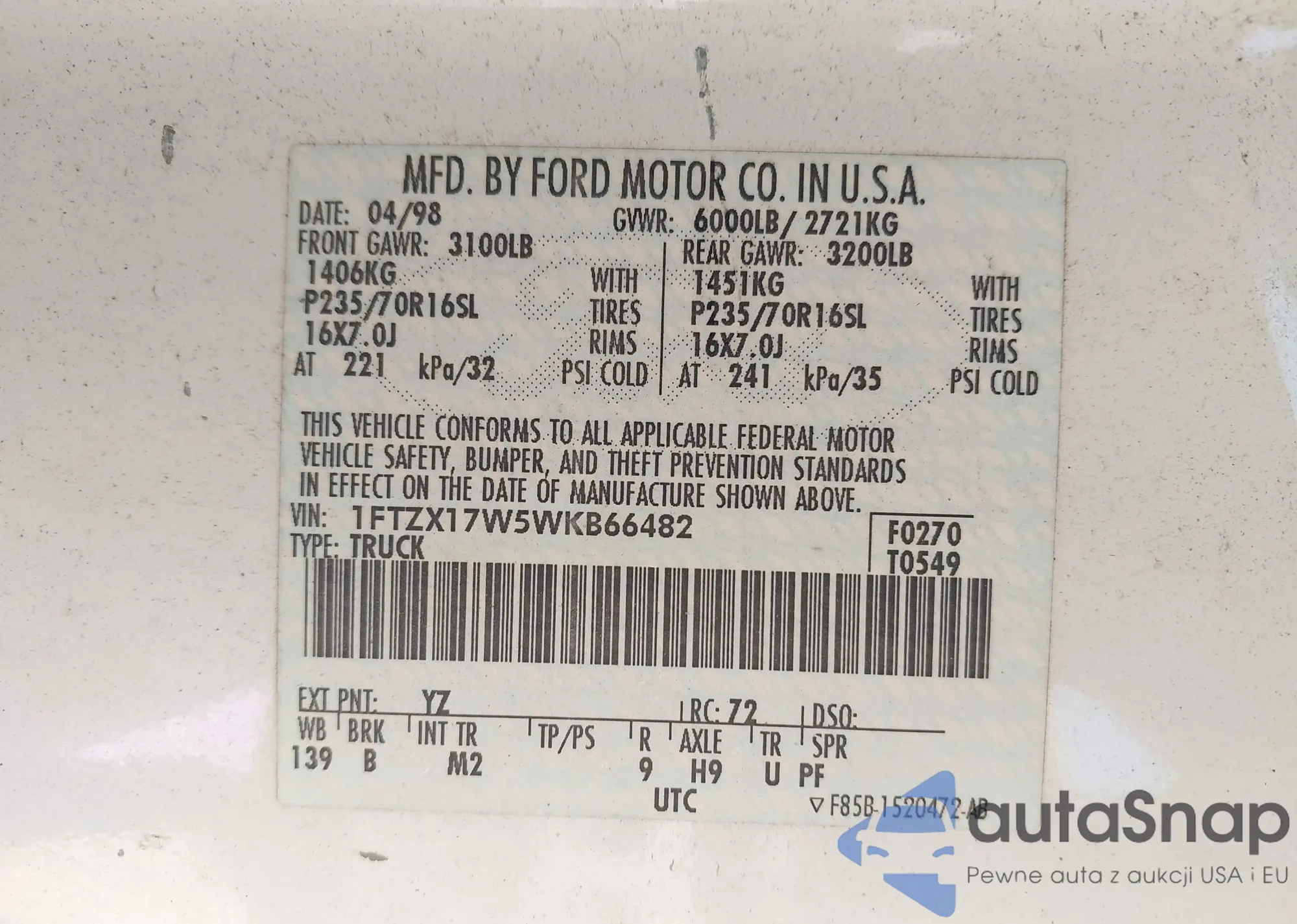 LOT: 42457871 VIN: 1FTZX17W5WKB66482