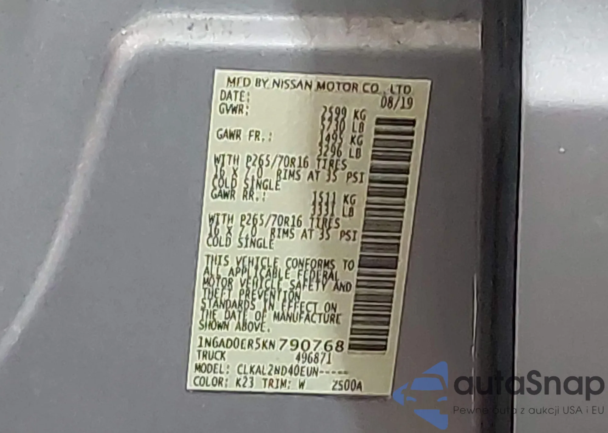 • VIN 1N6AD0ER5KN790768