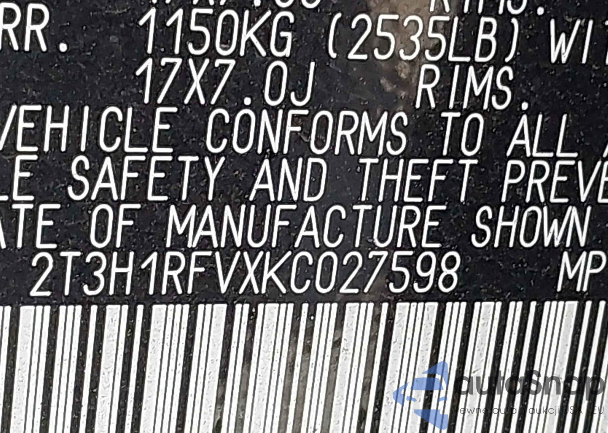 LOT: 42287894 VIN: 2T3H1RFVXKC027598