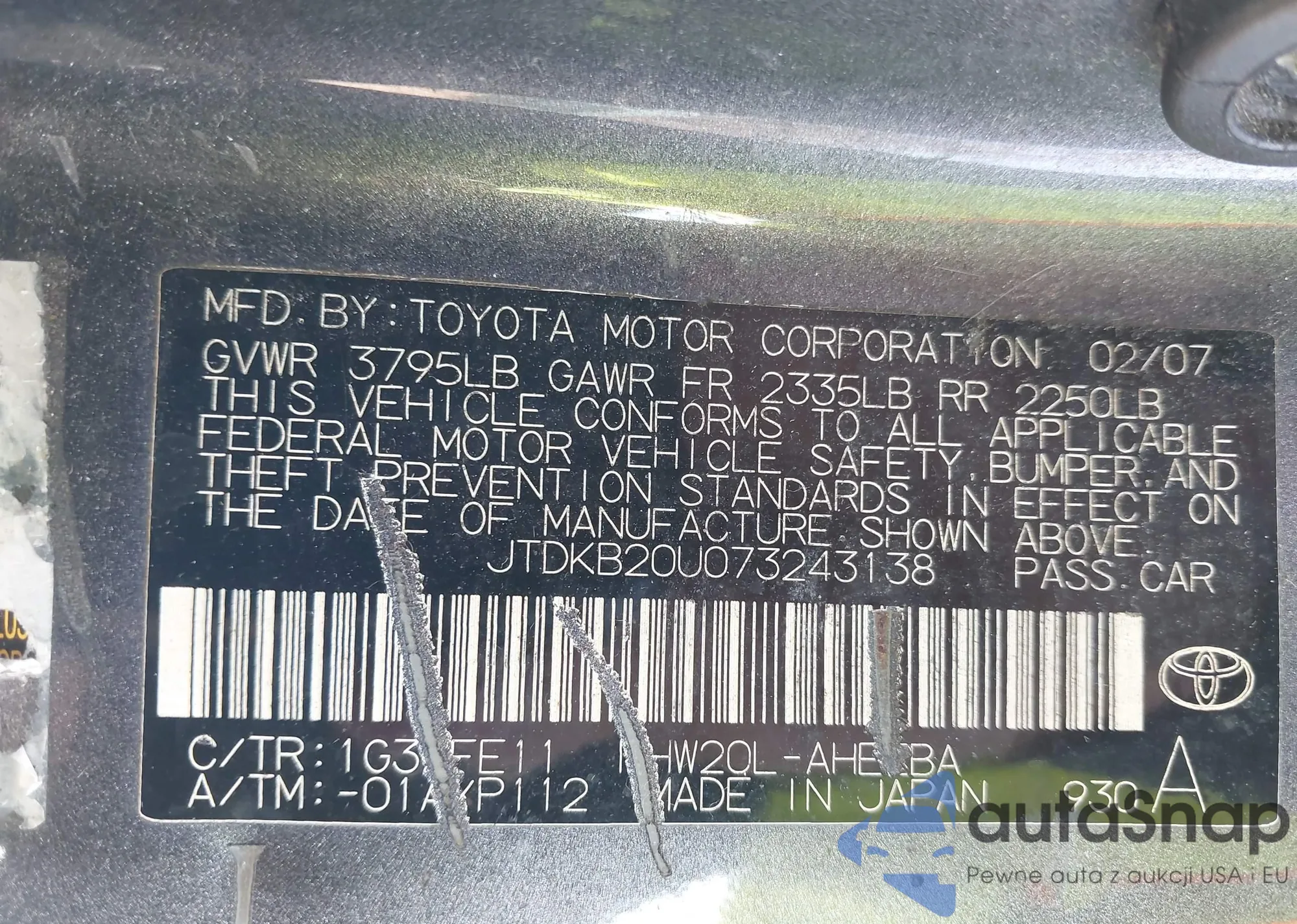 LOT: 41924497 VIN: JTDKB20U073243138