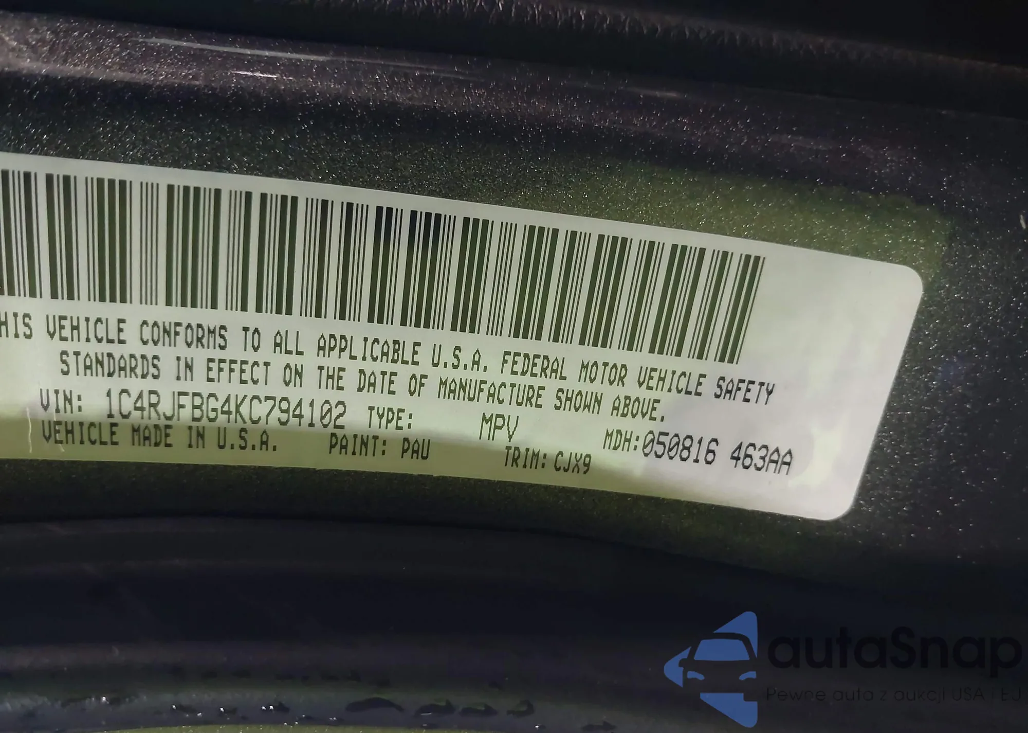 • VIN 1C4RJFBG4KC794102