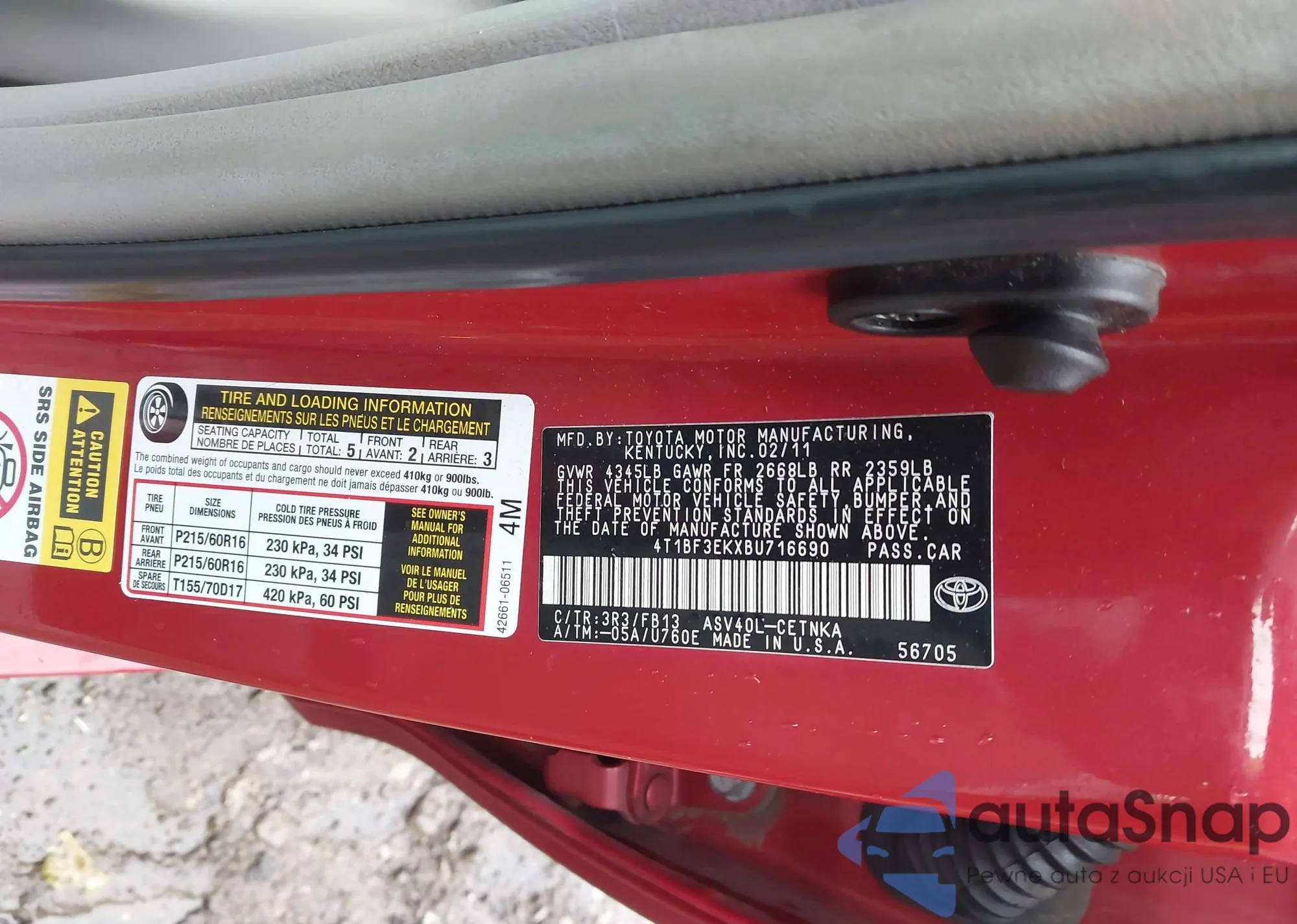 LOT: 42388917 VIN: 4T1BF3EKXBU716690