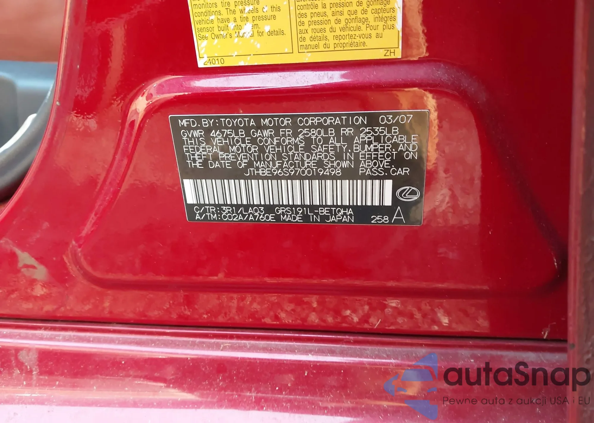 LOT: 42417139 VIN: JTHBE96S970019498