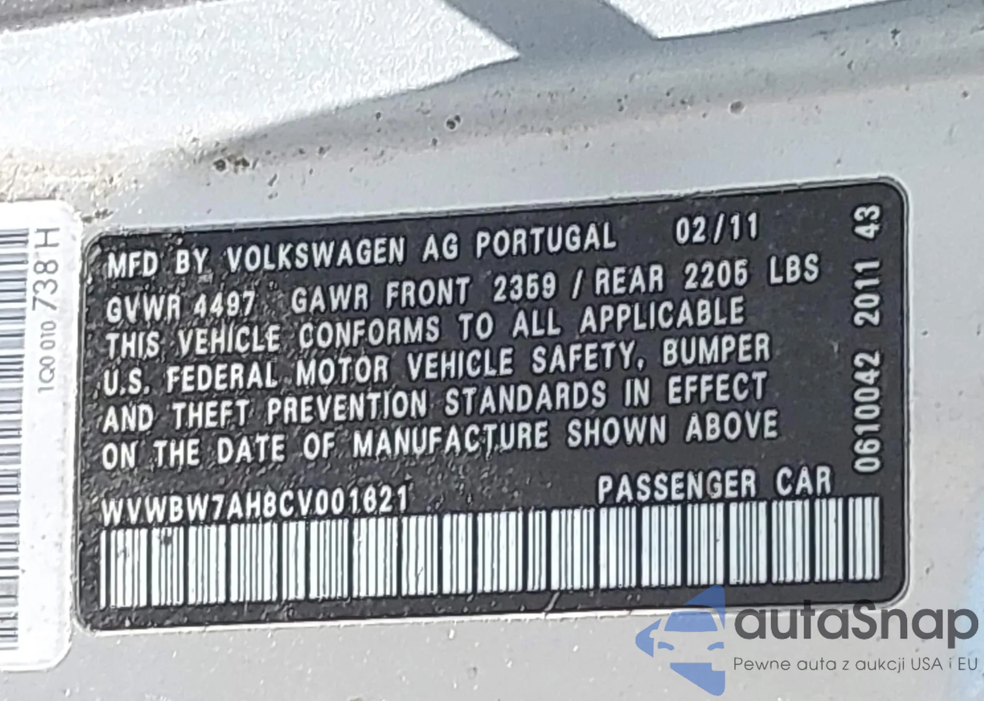• VIN WVWBW7AH8CV001621