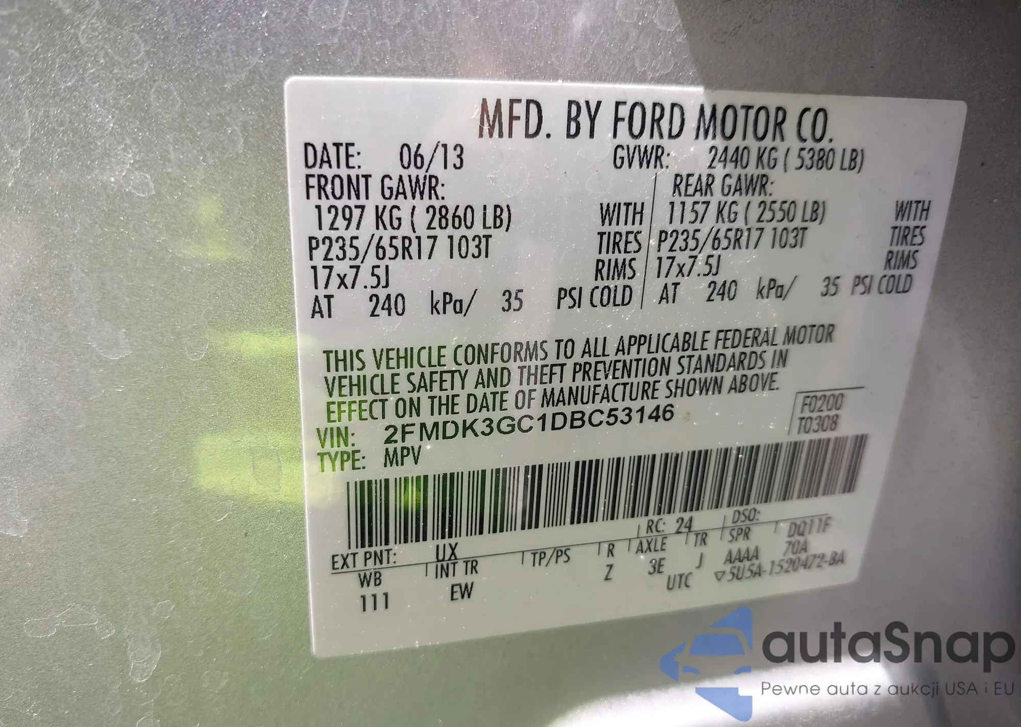 LOT: 42313724 VIN: 2FMDK3GC1DBC53146