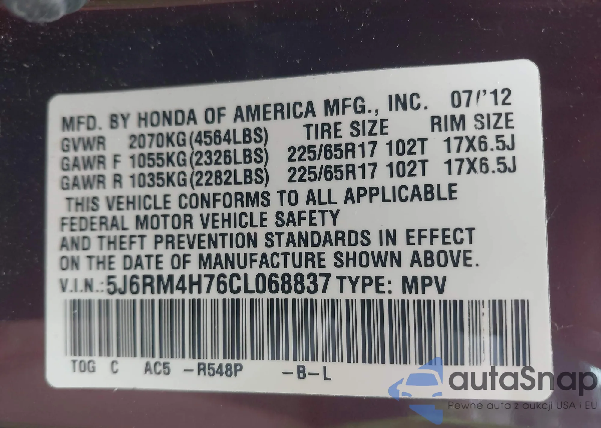 LOT: 42343180 VIN: 2HNYD18621H542147
