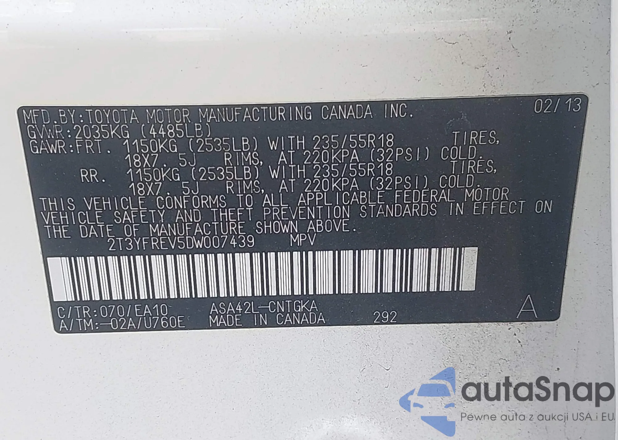 LOT: 42295024 VIN: 2T3YFREV5DW007439