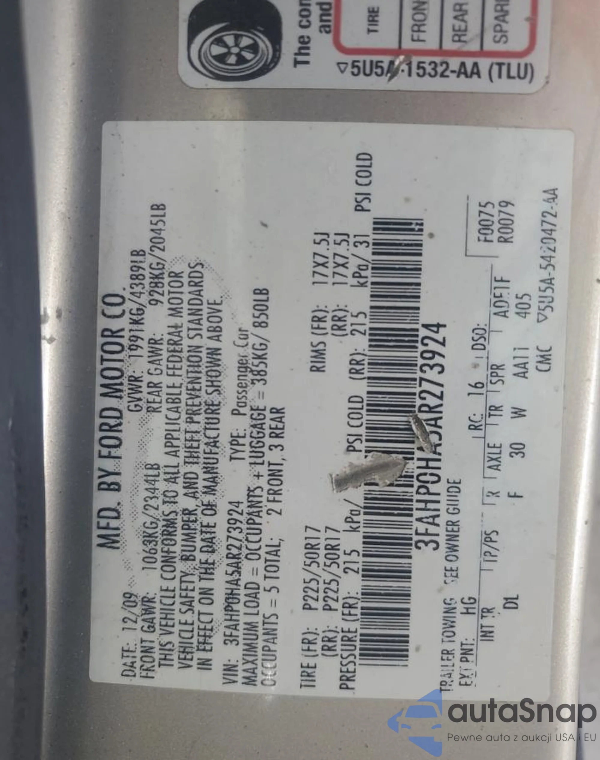 • VIN 3FAHP0HA5AR273924