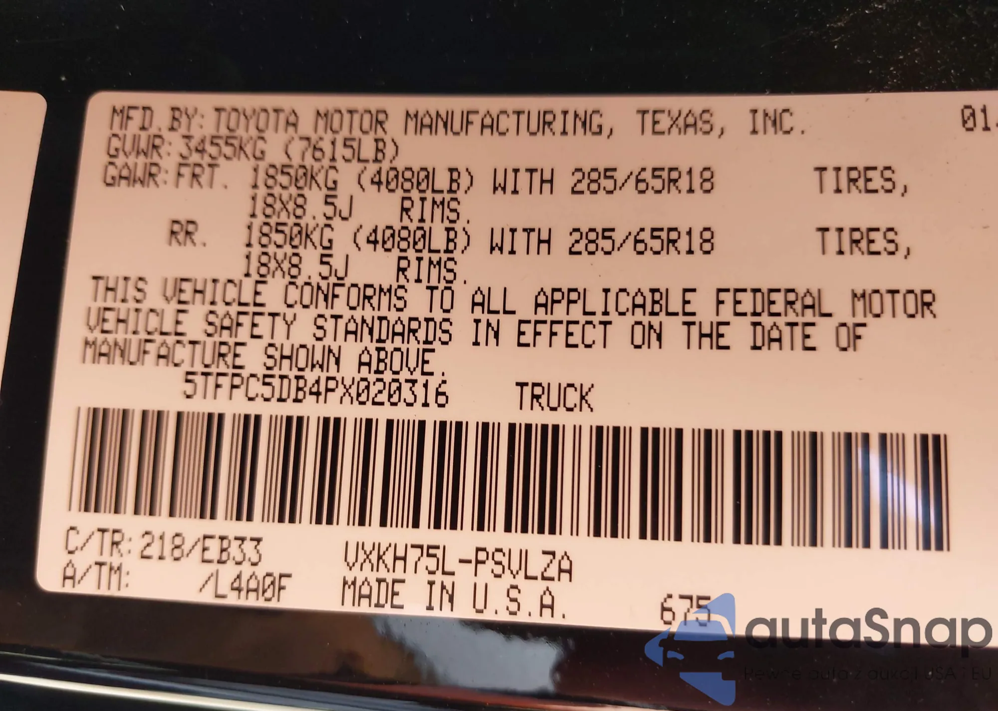 • VIN 5TFPC5DB4PX020316