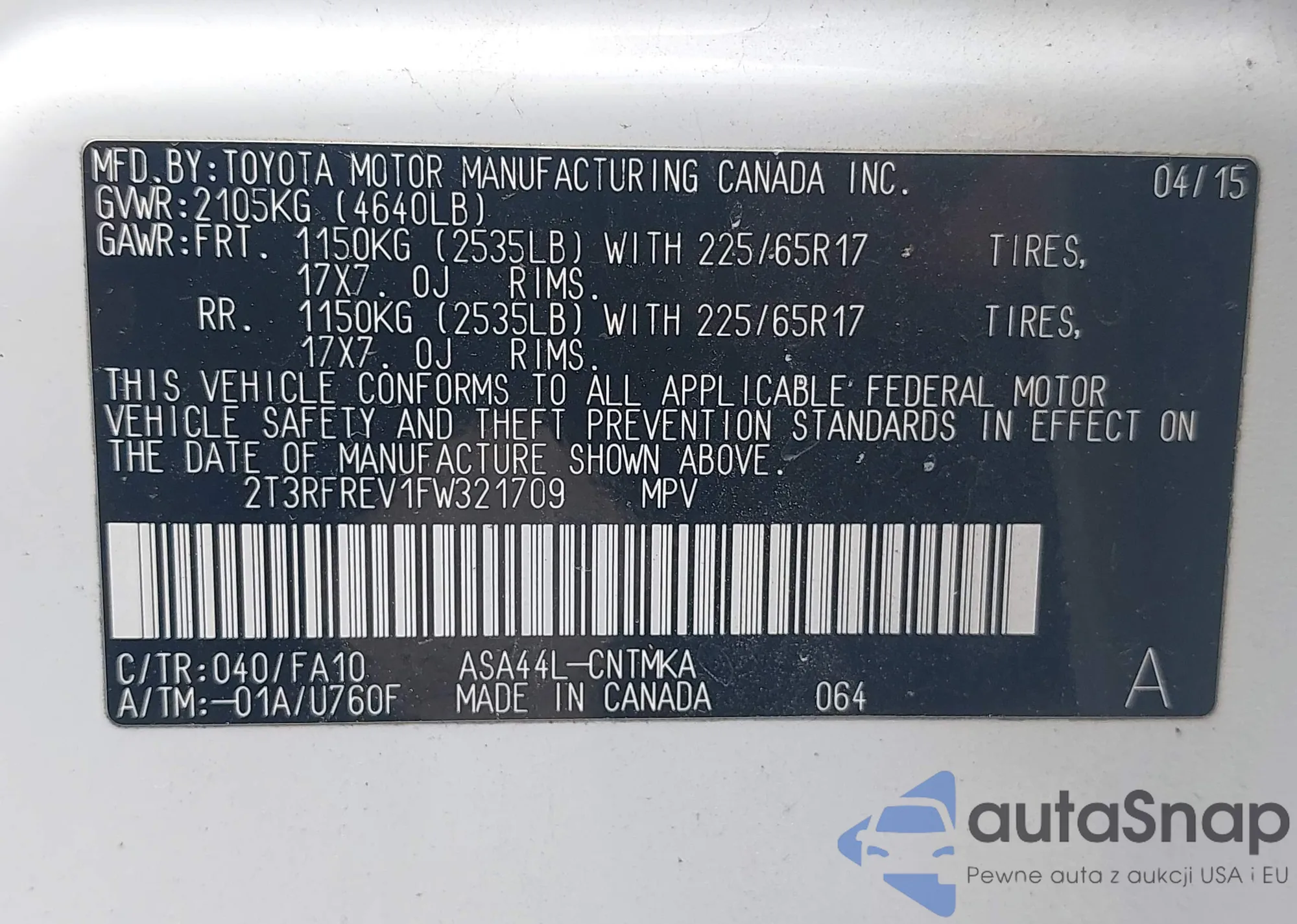 LOT: 42455123 VIN: 2T3RFREV1FW321709
