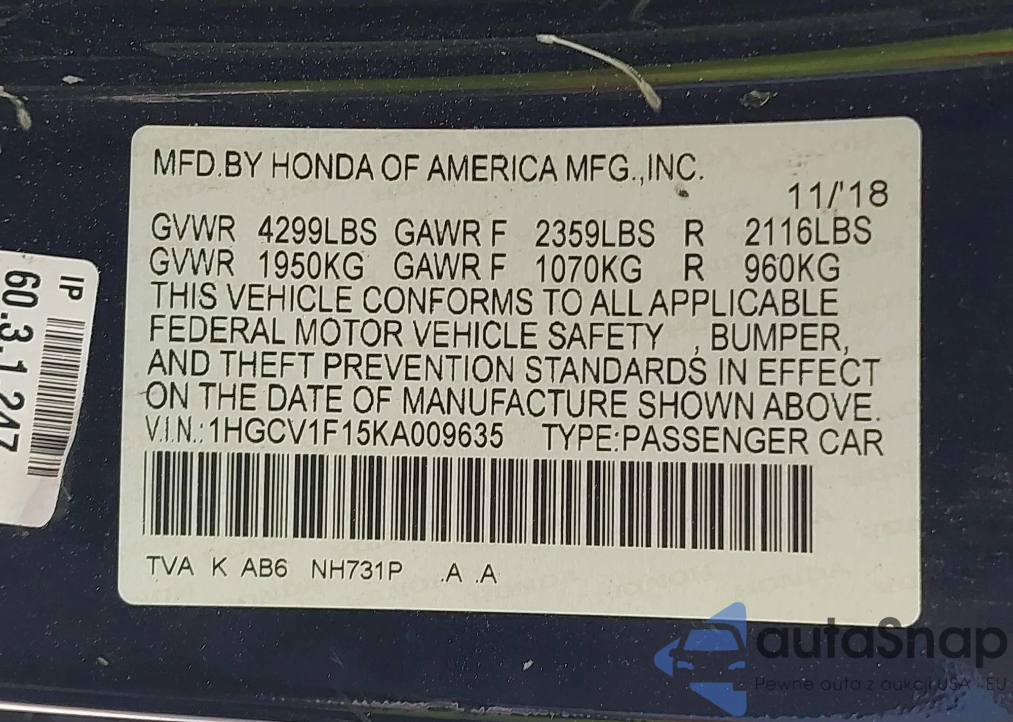 • VIN 1HGCV1F15KA009635