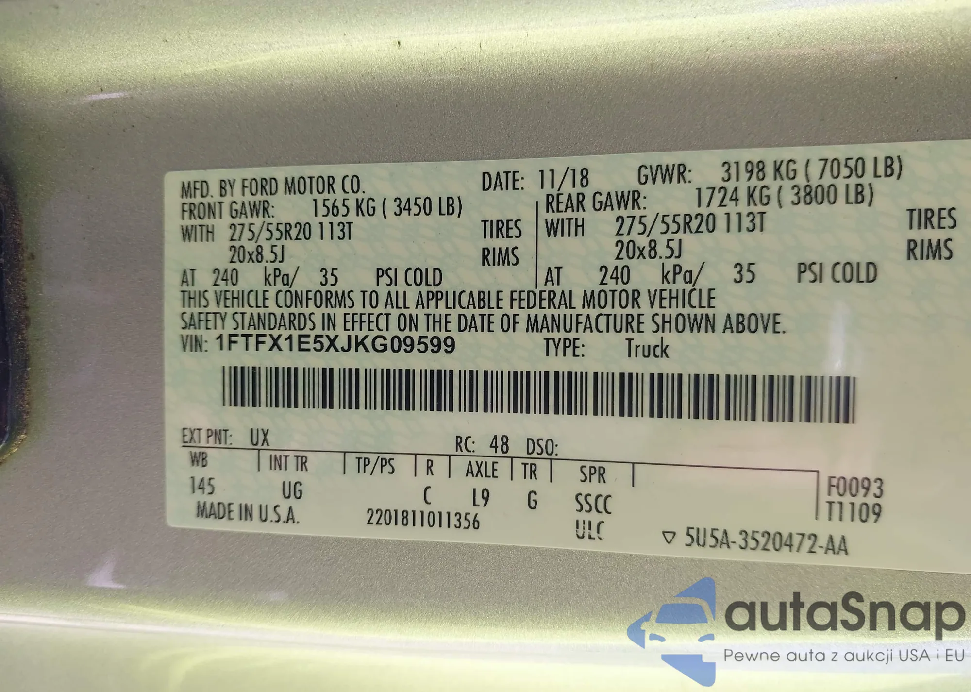 LOT: 42118481 VIN: 1FTFX1E5XJKG09599