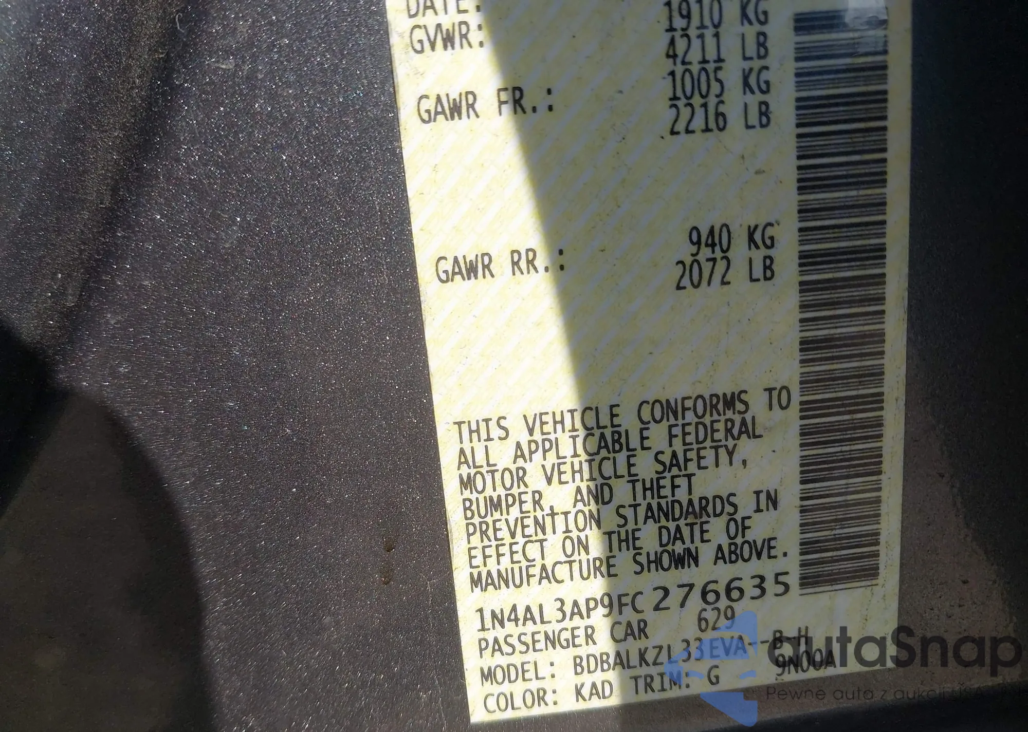 LOT: 42053237 VIN: 3N1AB7AP9FY319675