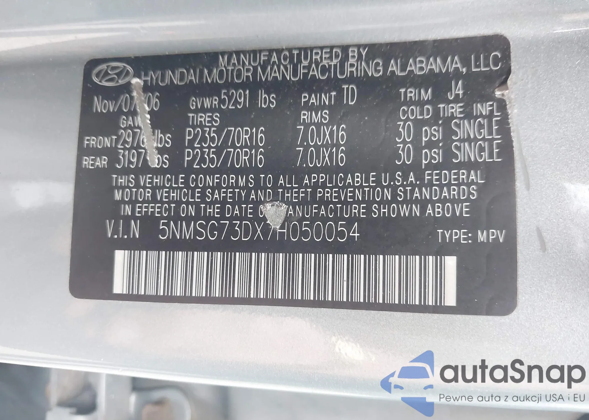 • VIN 5NMSG73DX7H050054
