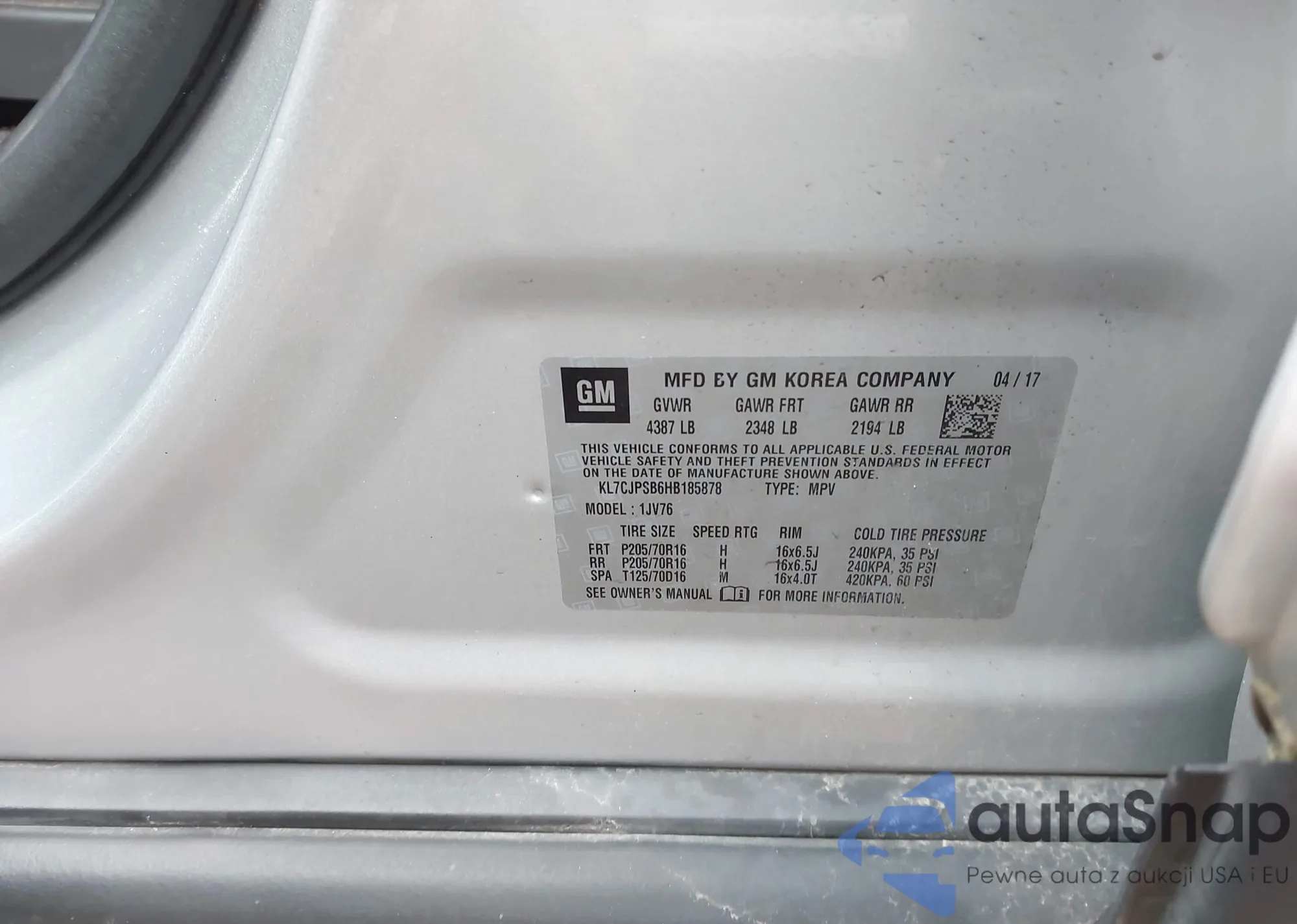 LOT: 42007070 VIN: KL7CJPSB6HB185878