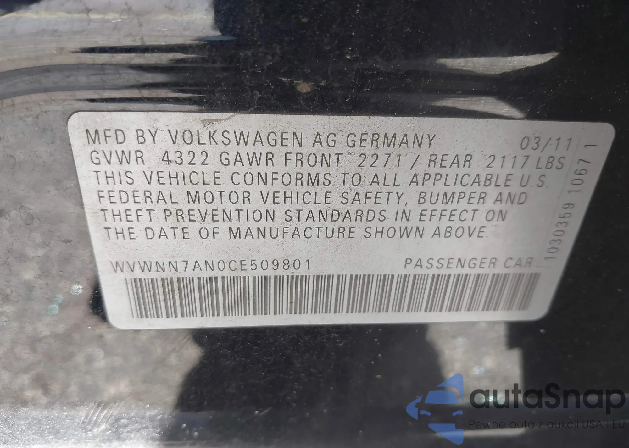 LOT: 42058682 VIN: WVWNN7AN0CE509801