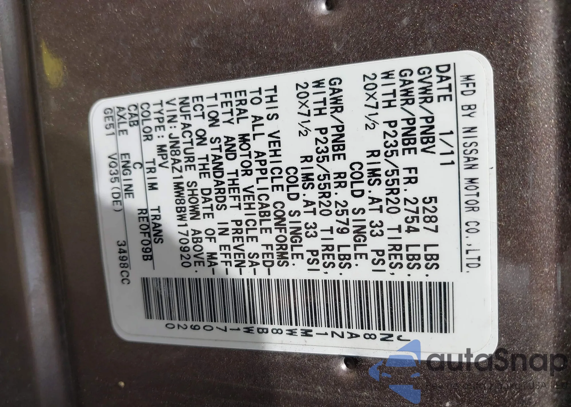 • VIN JN8AZ1MW8BW170920