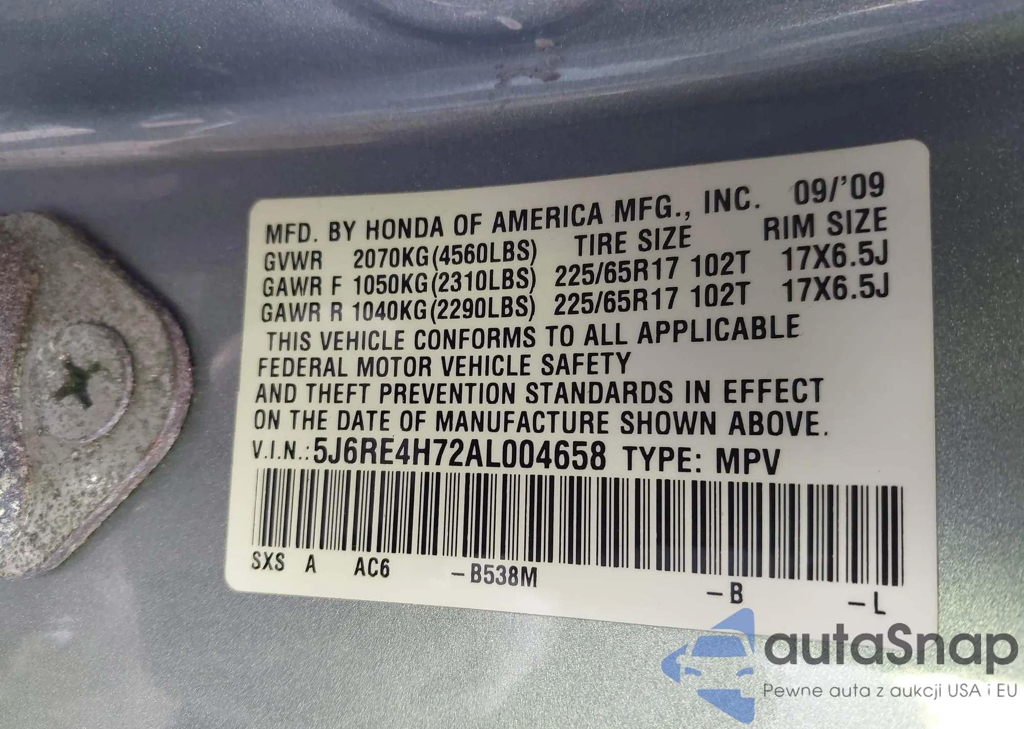 • VIN 5J6RE4H72AL004658