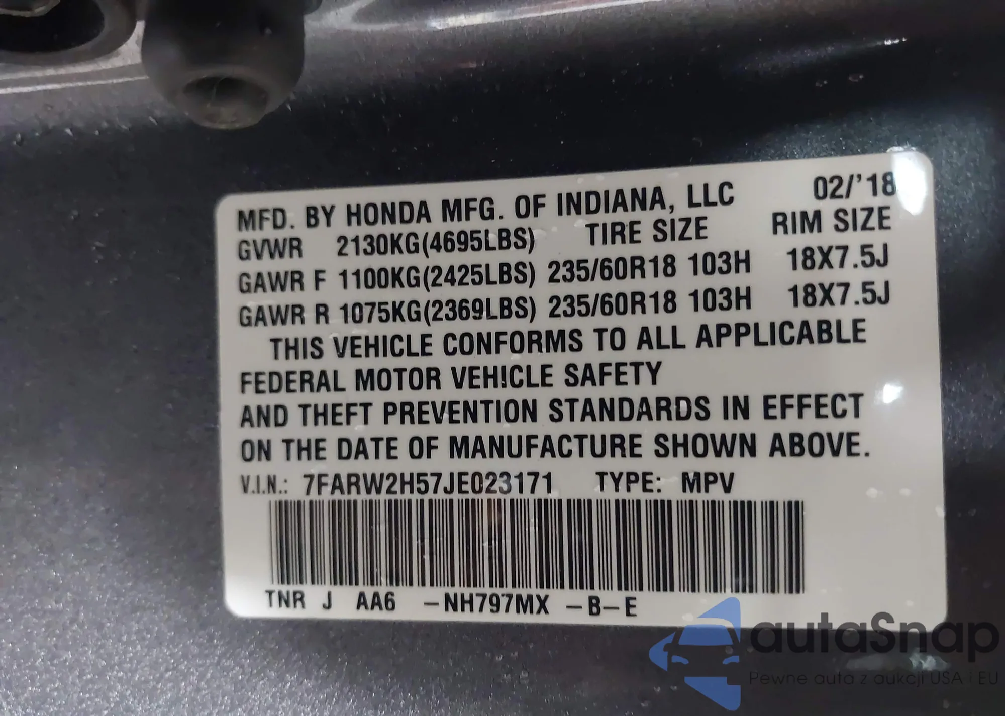 LOT: 42307001 VIN: 7FARW2H57JE023171