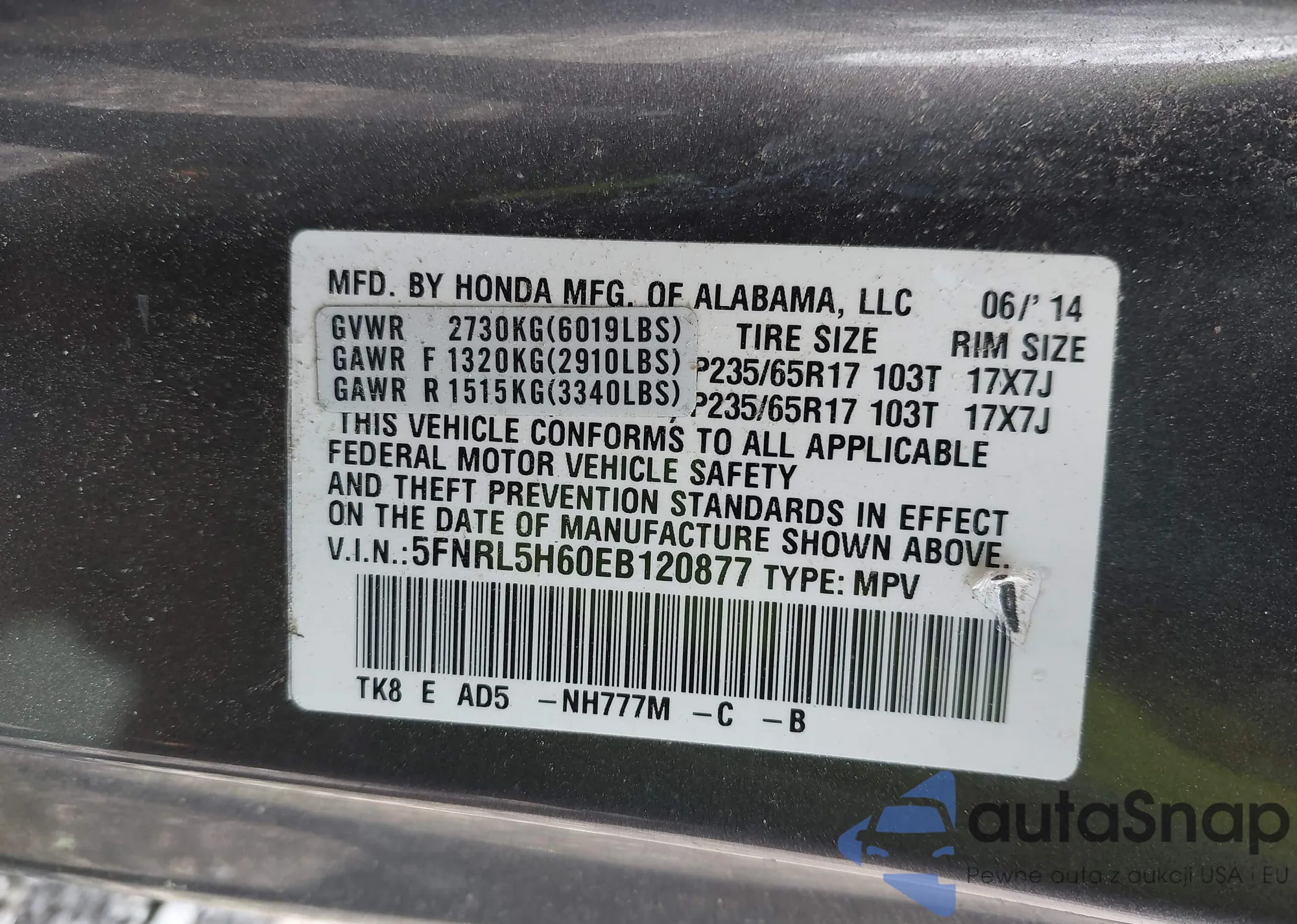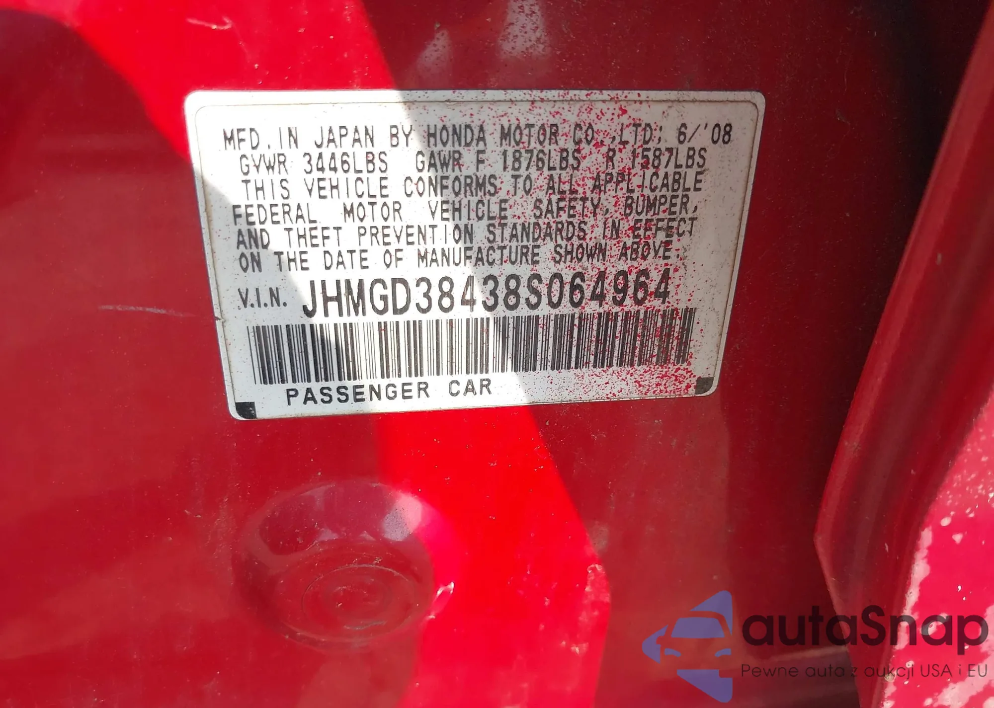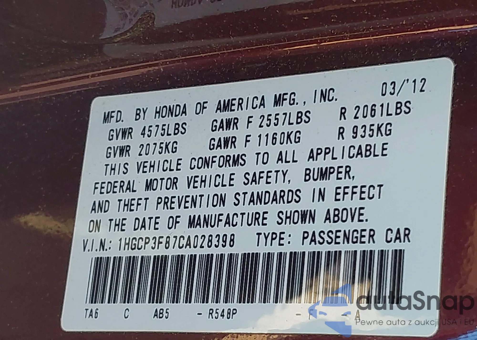 LOT: 42020962 VIN: 1HGCP3F87CA028398