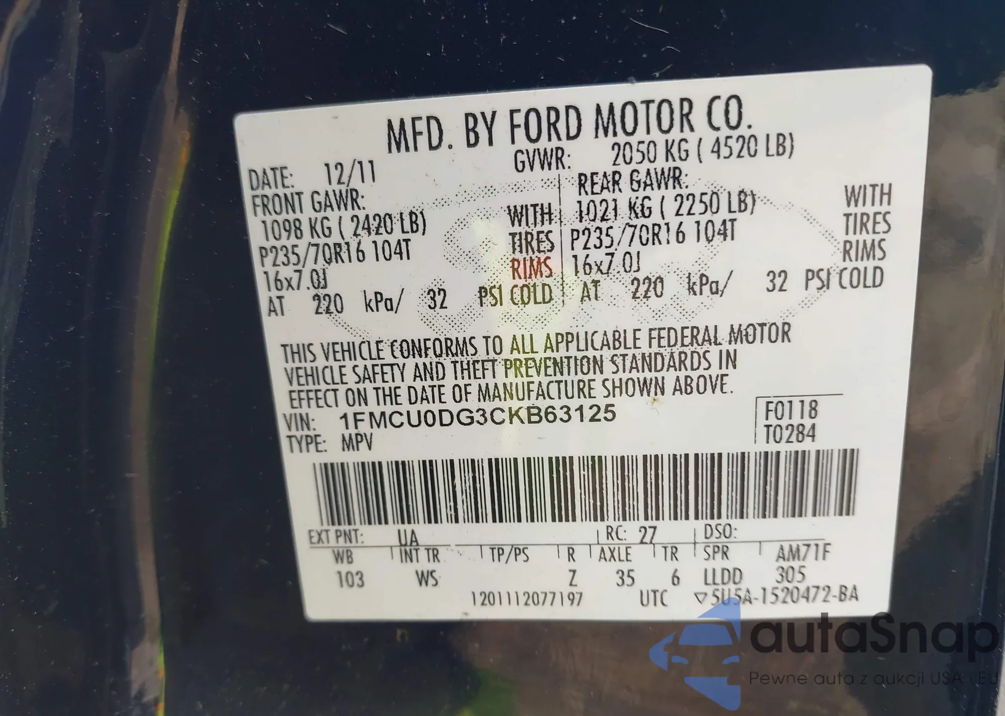 • VIN 1FMCU0DG3CKB63125