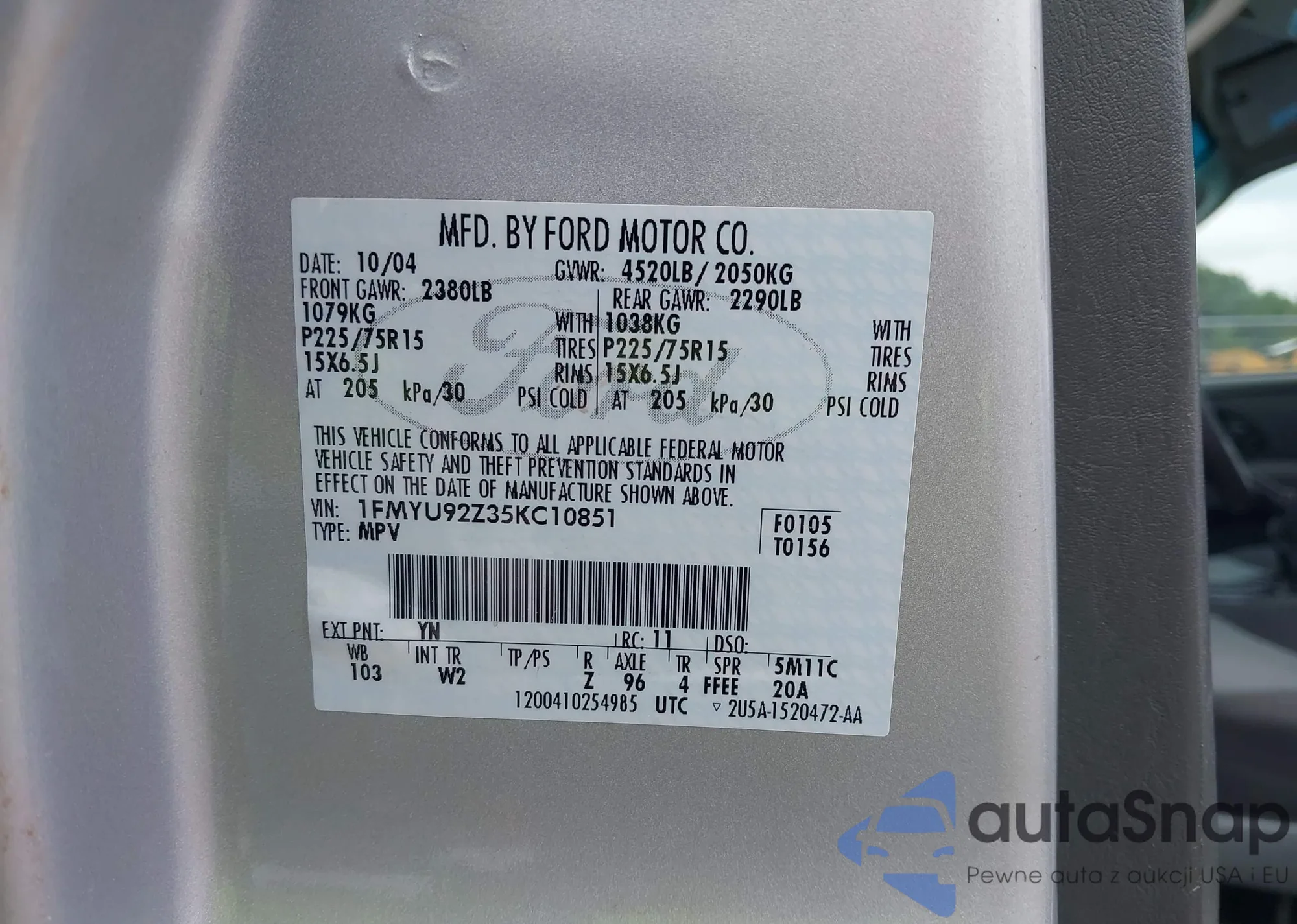 • VIN 1FMYU92Z35KC10851