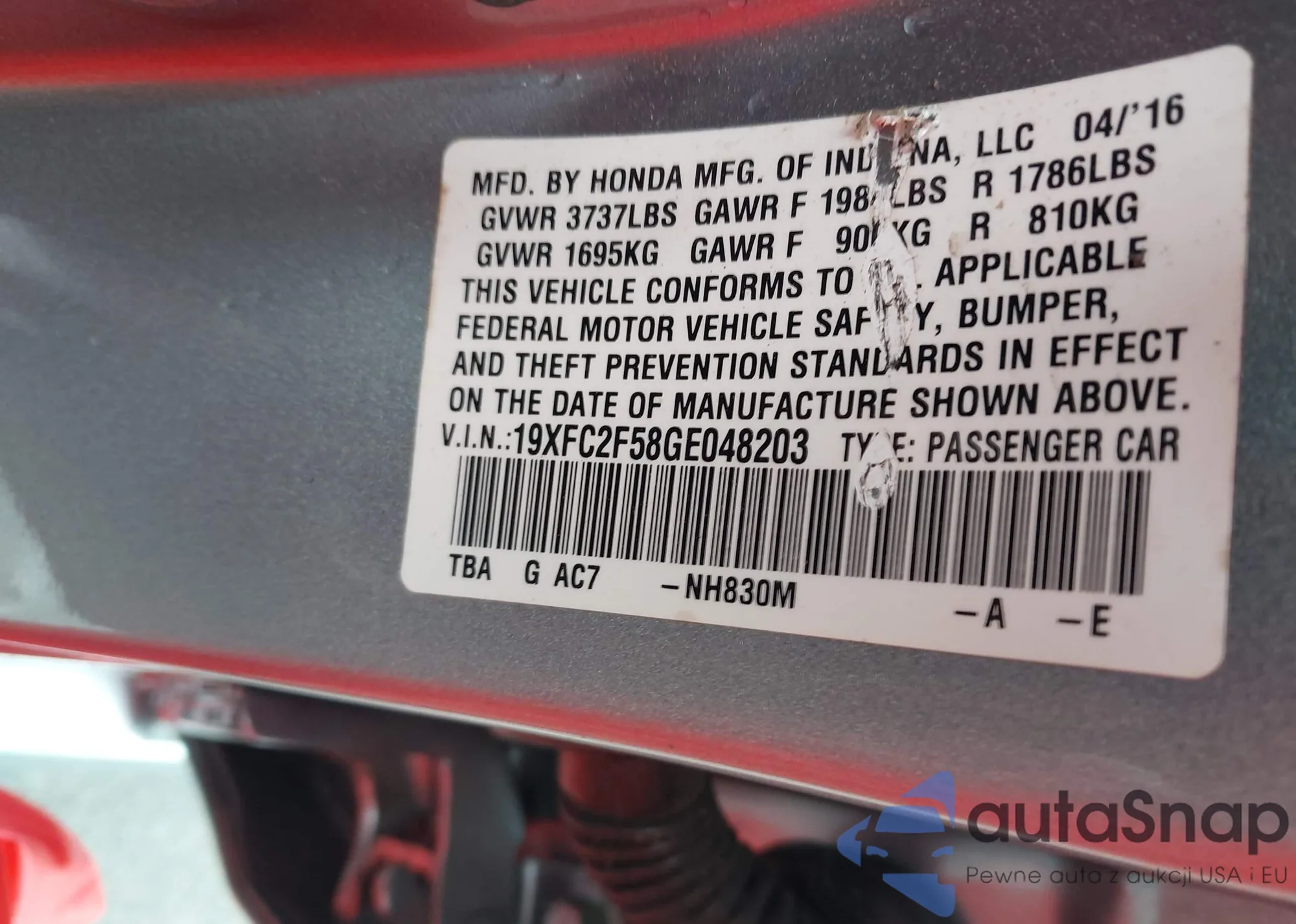 LOT: 42313735 VIN: 19XFC2F58GE048203