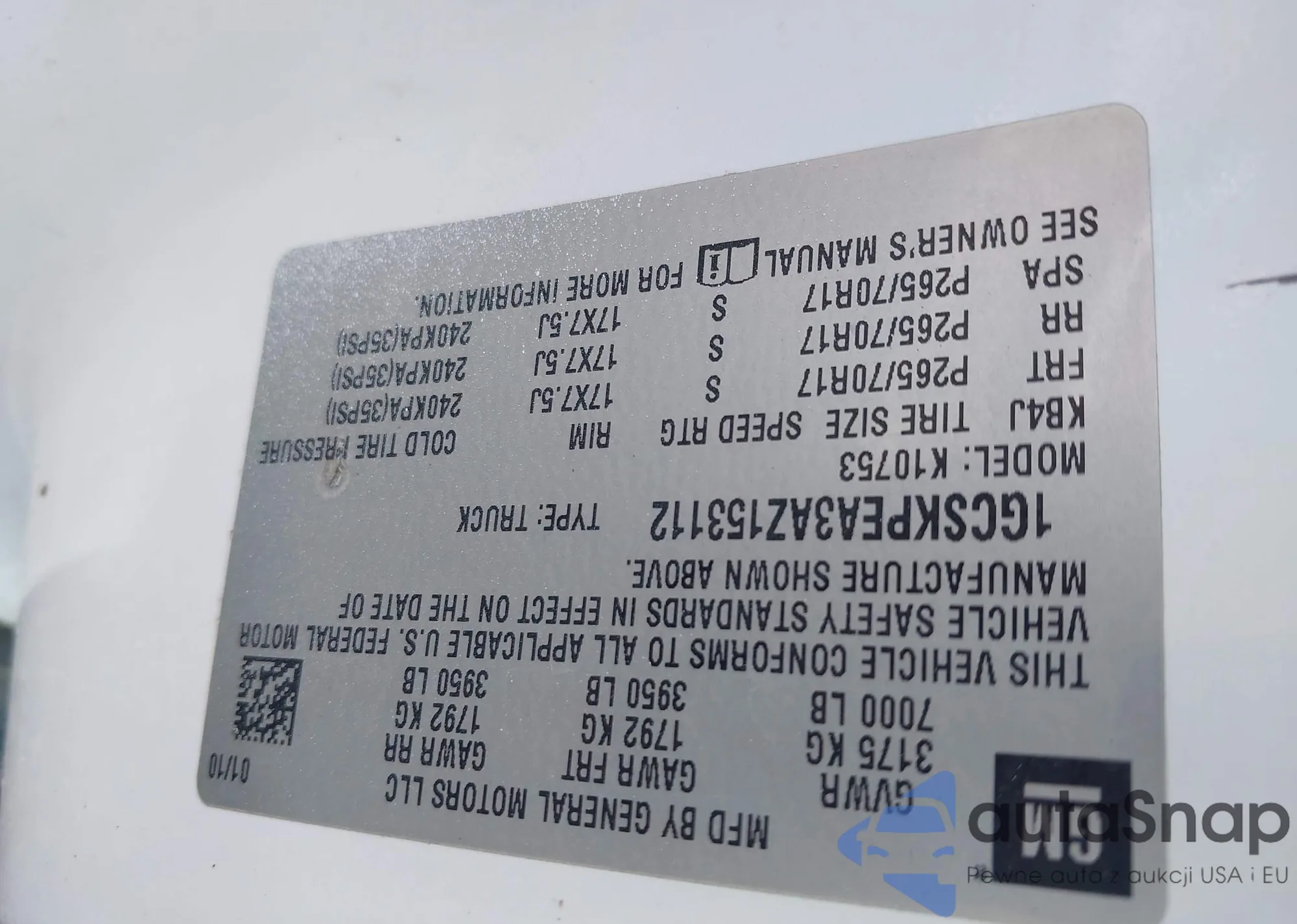 LOT: 42538869 VIN: 1GCSKPEA3AZ153112