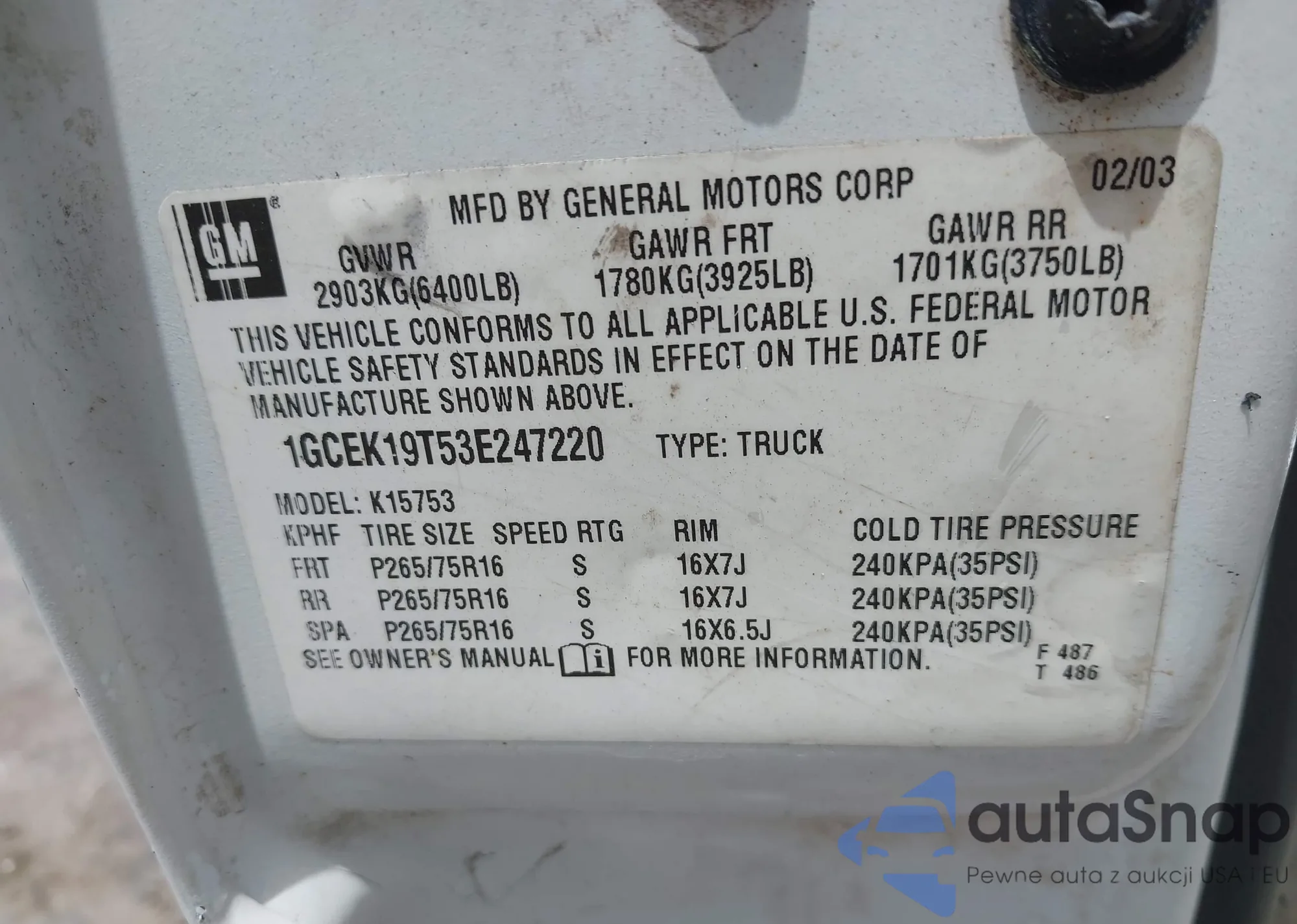 • VIN 1GCEK19T53E247220