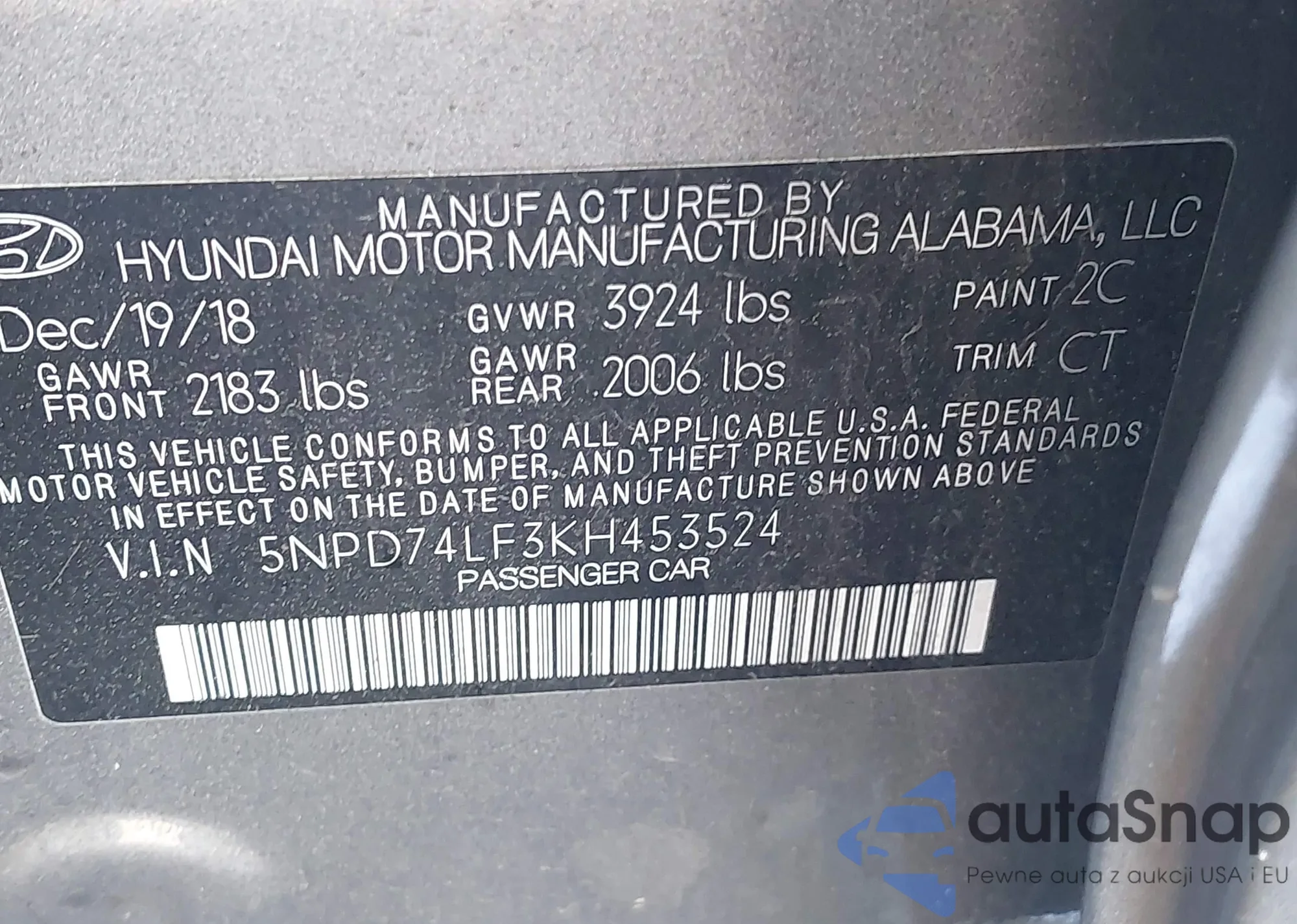 LOT: 42062706 VIN: 5NPD74LF3KH453524