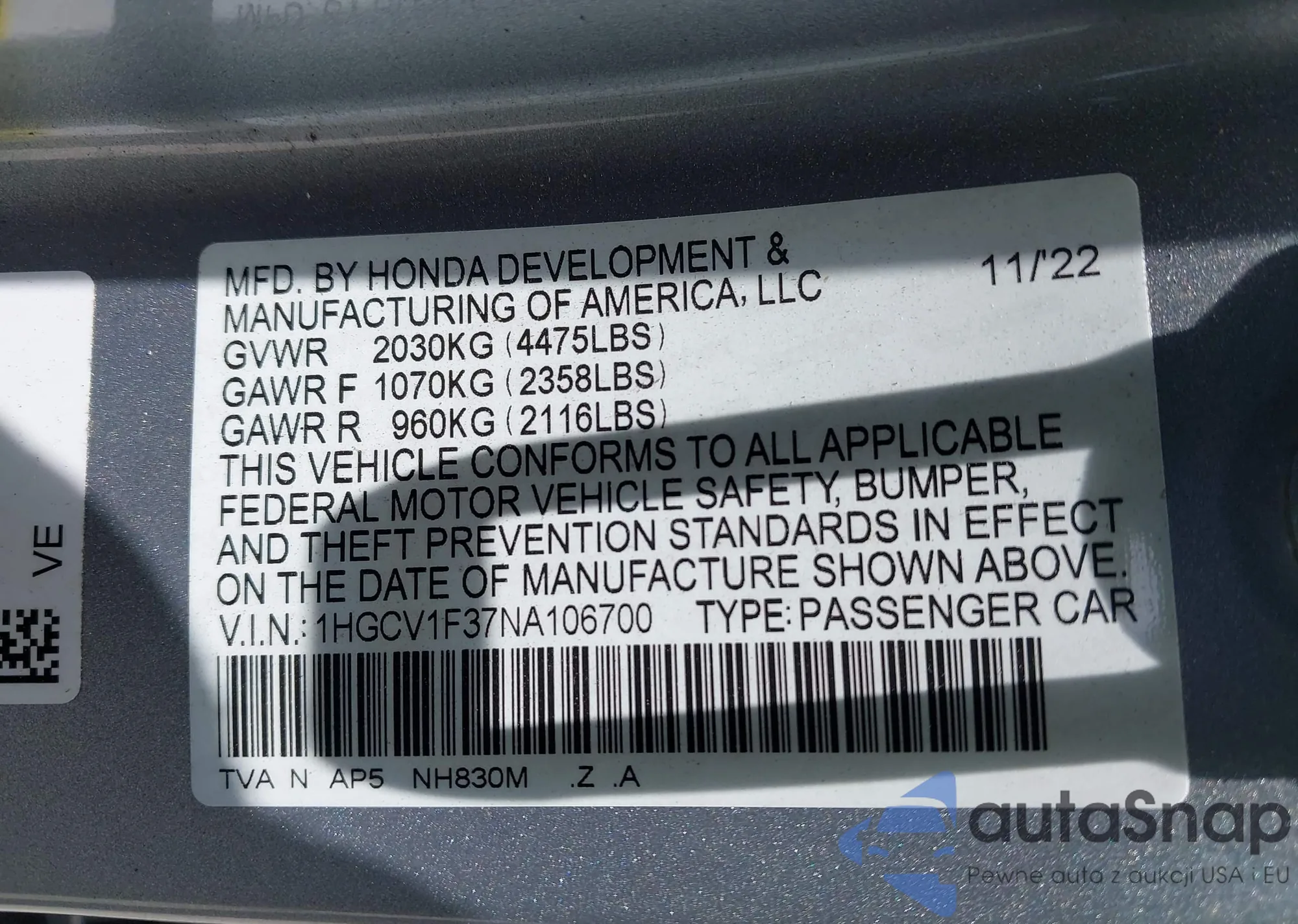 • VIN 1HGCV1F37NA106700