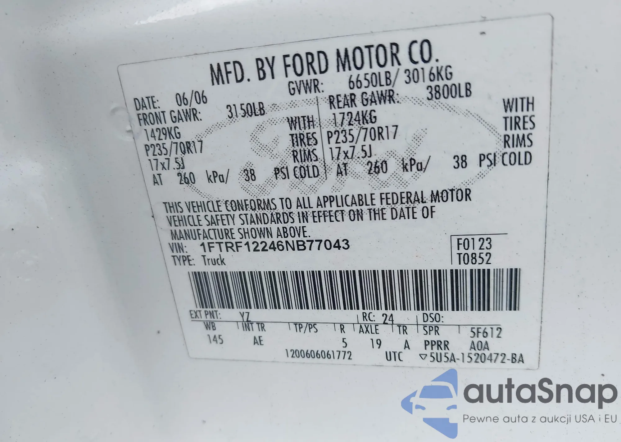 LOT: 42439227 VIN: 1FTRF12246NB77043