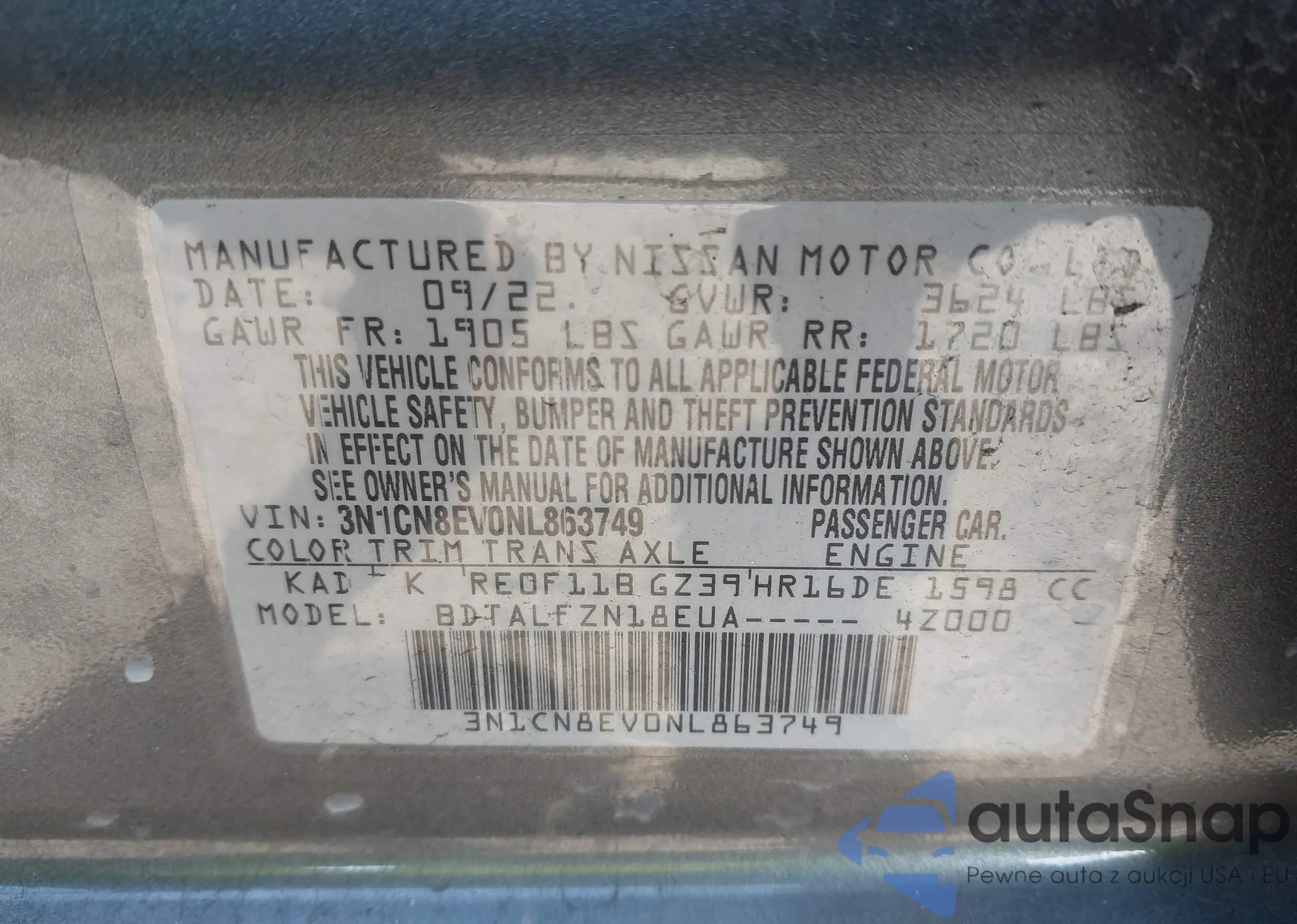 • VIN 3N1CN8EV0NL863749