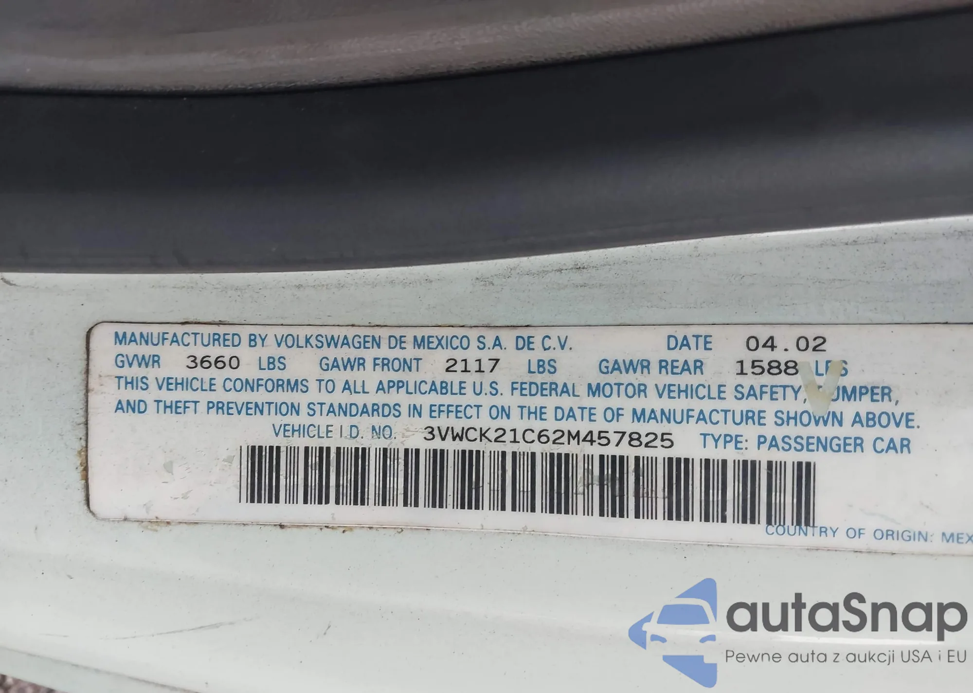 • VIN 3VWCK21C62M457825