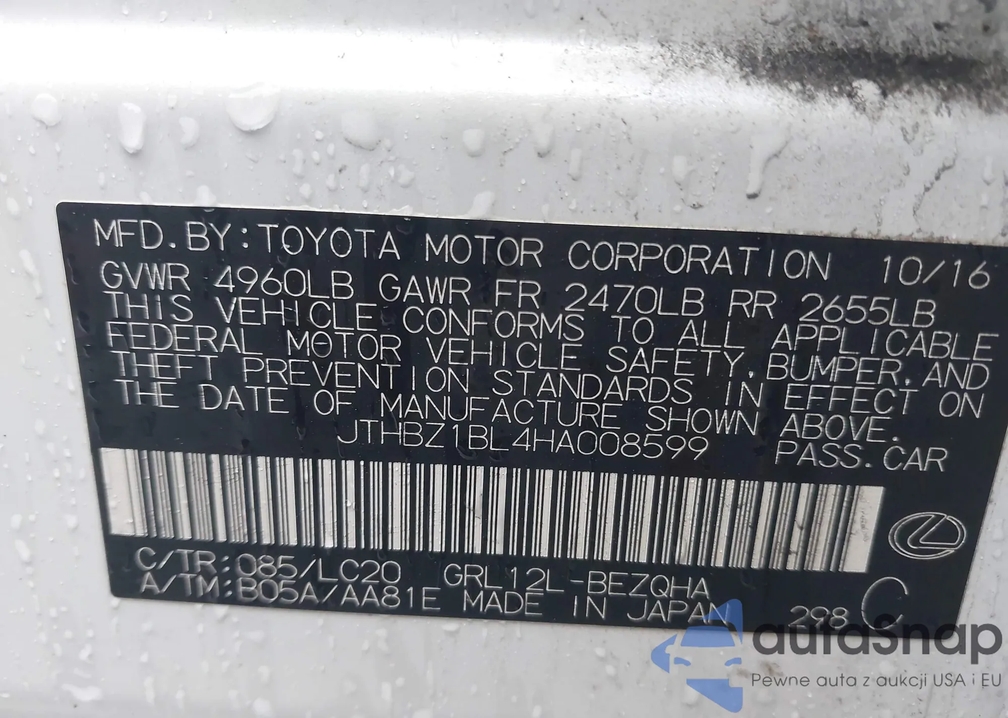 • VIN JTHBZ1BL4HA008599